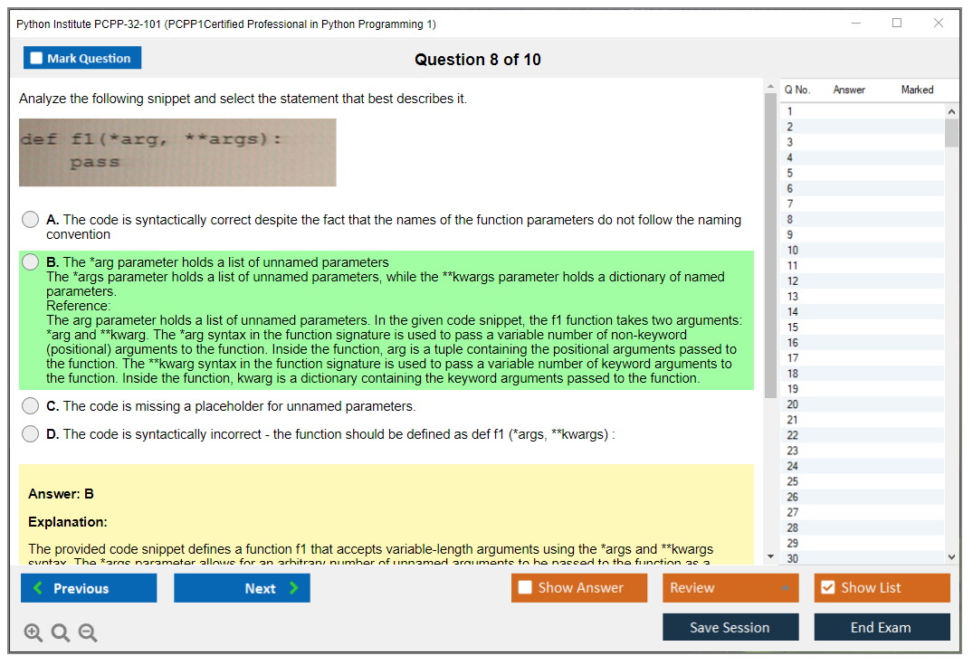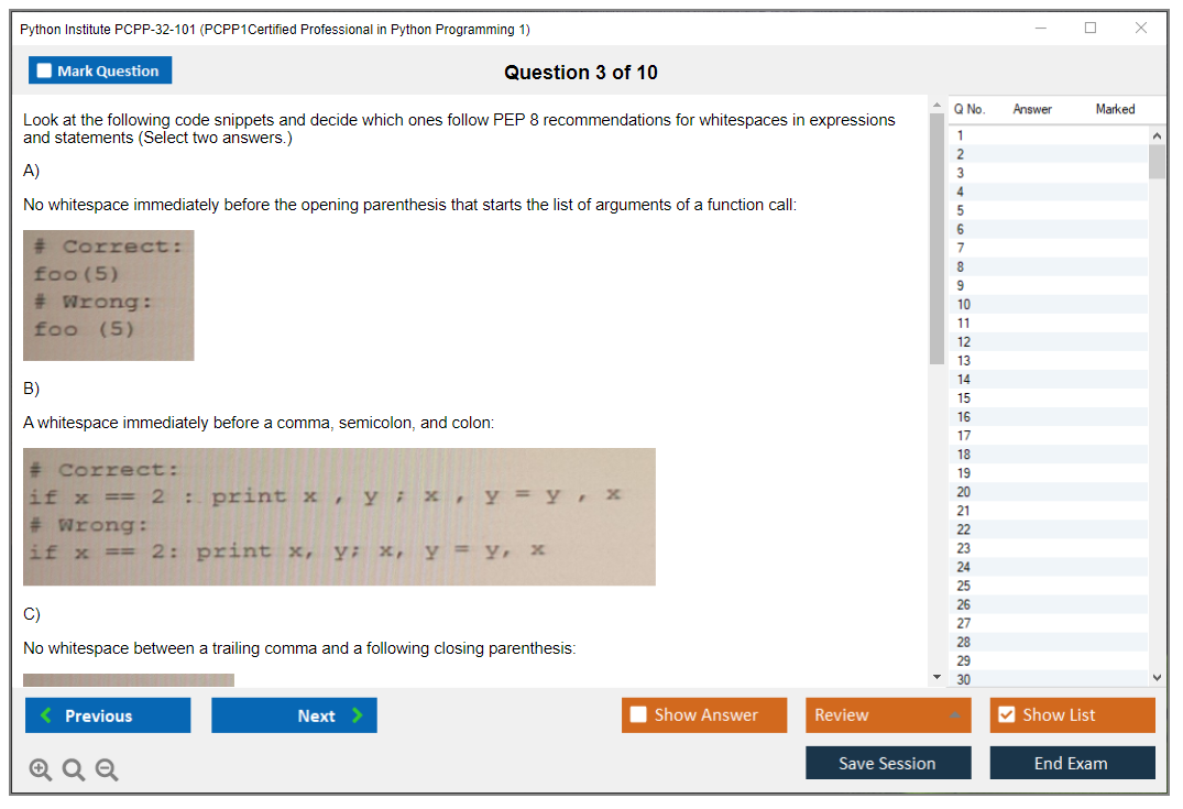 The question format of the Python Institute PCPP-32-101 exam includes multiple-choice questions, single-choice questions, and code-based questions.