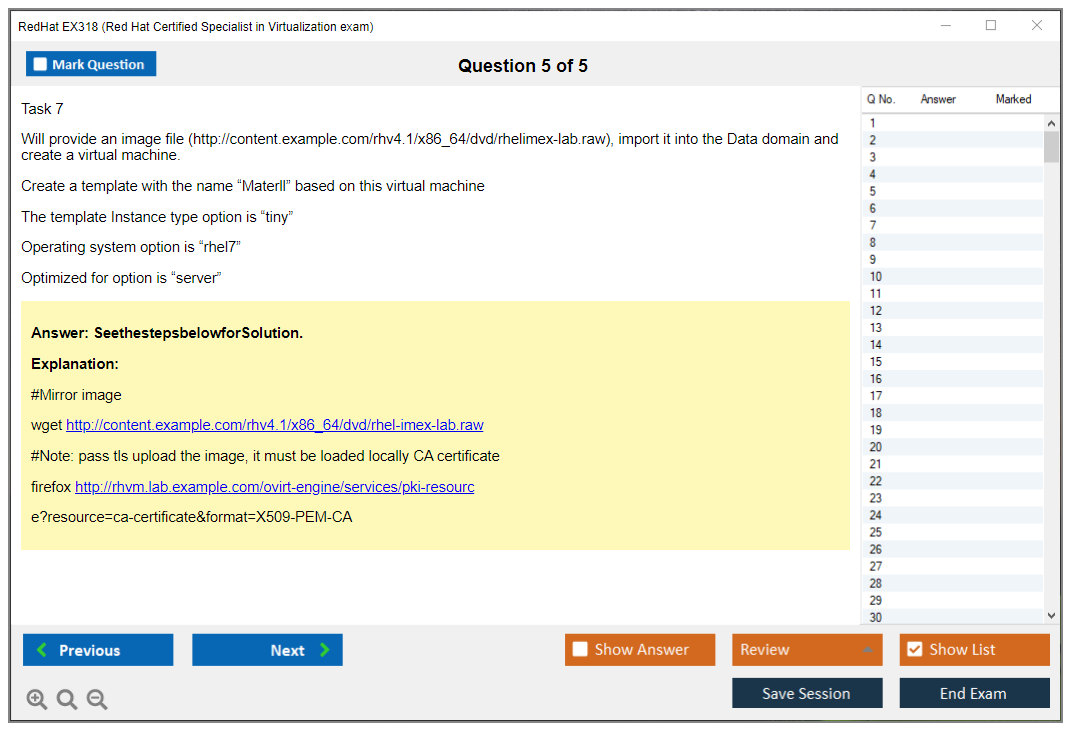 The Red Hat Certified Specialist in Virtualization exam (EX318) tests your knowledge and skills in managing and deploying virtualized environments using Red Hat Virtualization. It is a hands-on, practical exam that requires you to perform real-world tasks.