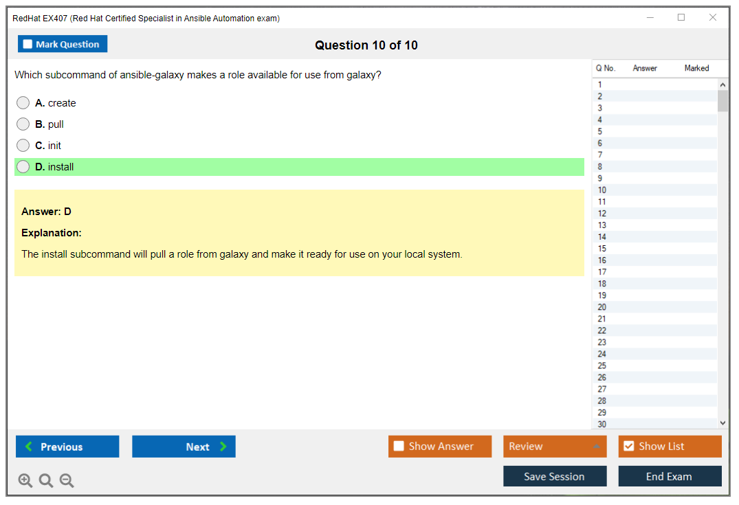 The Red Hat Certified Specialist in Ansible Automation exam (EX407) is designed to test your skills and knowledge in using Ansible to automate the management of systems. This certification demonstrates your ability to use Ansible for system configuration and management, and it is a valuable credential for IT professionals who want to validate their skills in automation.