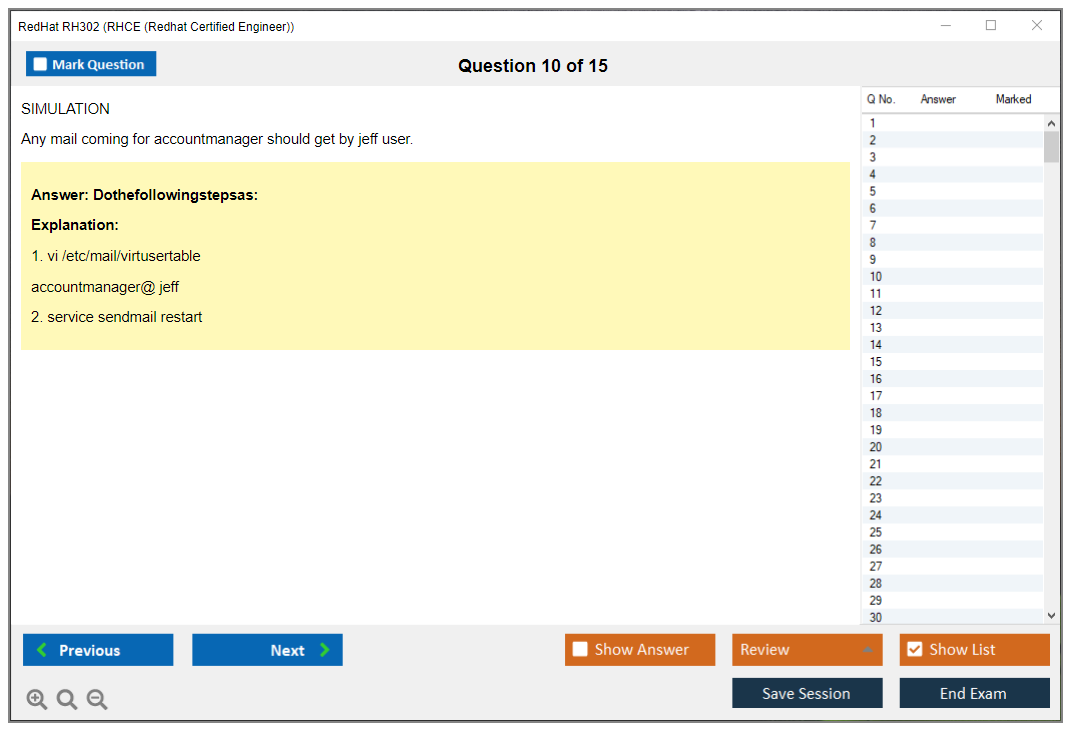 Sample questions for the Red Hat RH302 exam are not typically provided, as it is a performance-based exam. However, Red Hat offers training courses and practice exams to help candidates prepare.