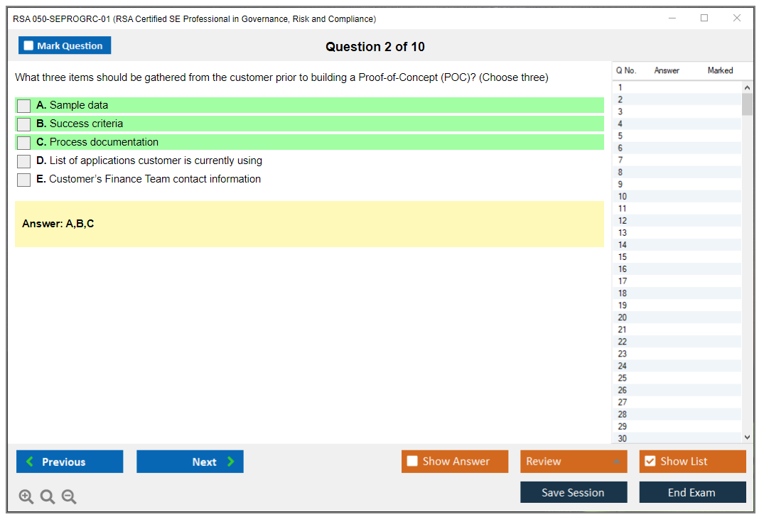 There are no formal prerequisites for the RSA 050-SEPROGRC-01 Exam, but having relevant experience and training is highly recommended.