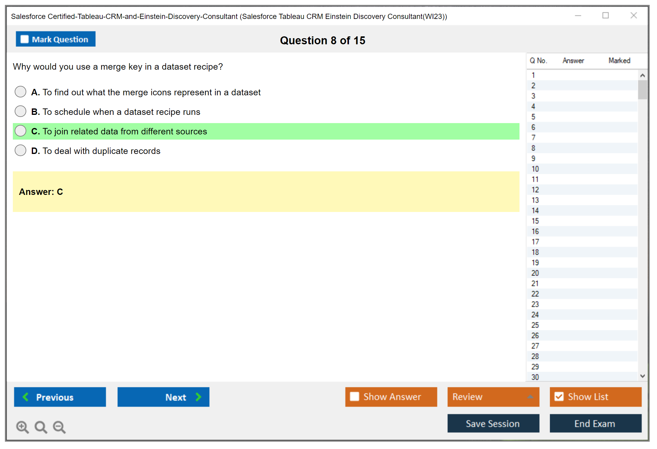 The Salesforce Certified Tableau CRM and Einstein Discovery Consultant exam is designed for individuals who have experience implementing and consulting on analytics solutions within the Salesforce ecosystem. This certification validates the knowledge and skills necessary to design, build, and support applications for Tableau CRM and Einstein Discovery.