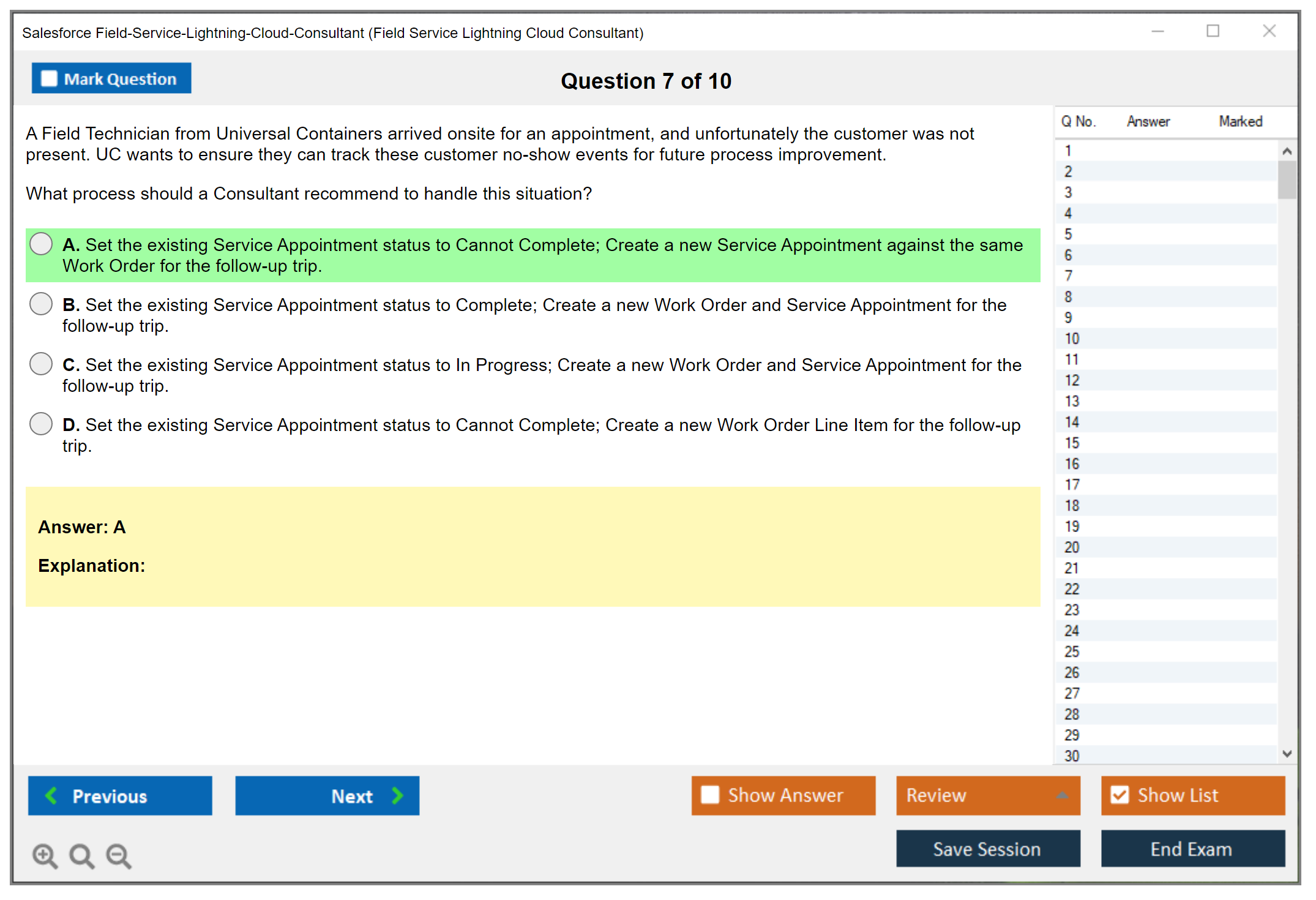 The Salesforce Field Service Lightning Cloud Consultant exam consists of 60 multiple-choice/multiple-select questions.