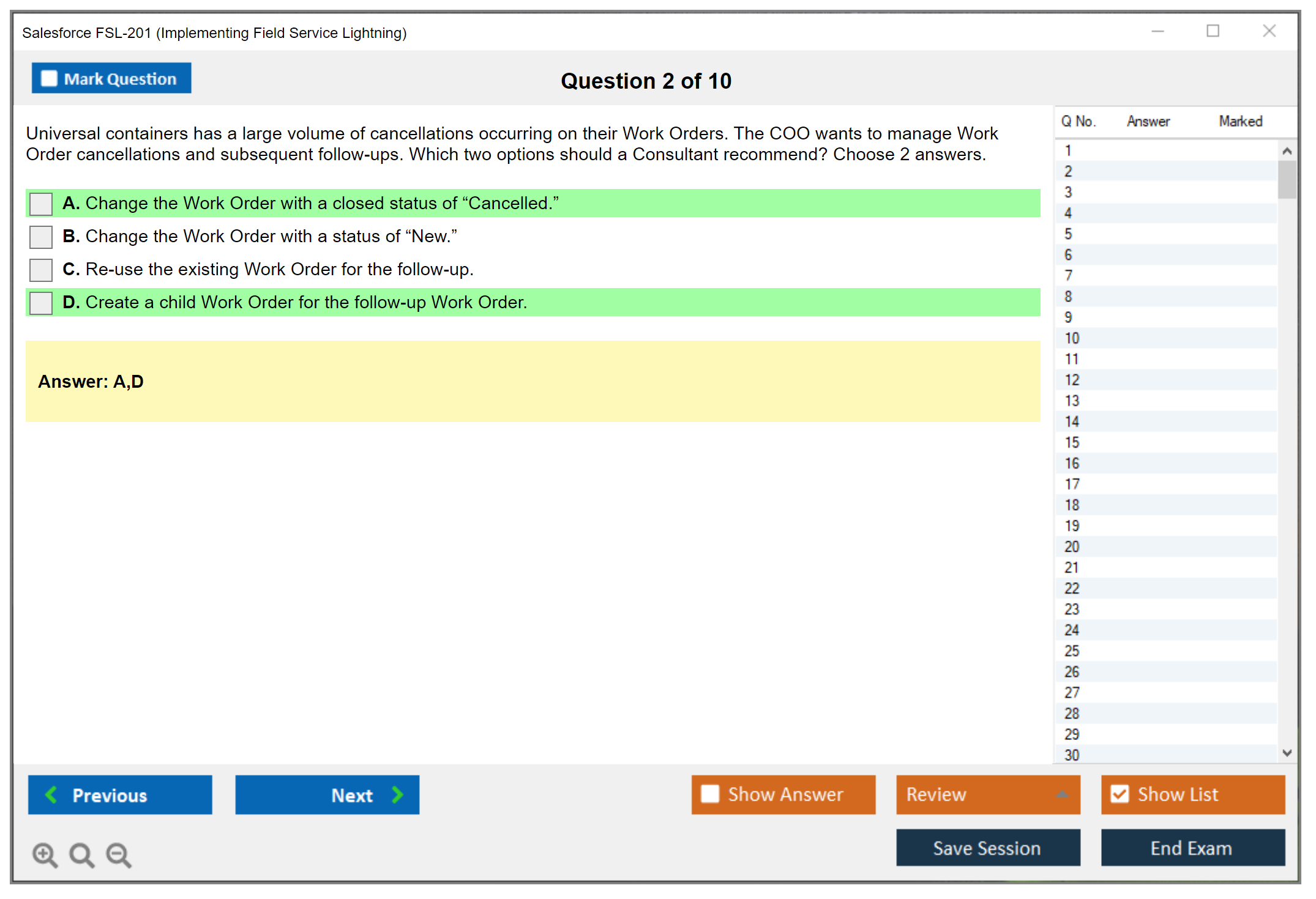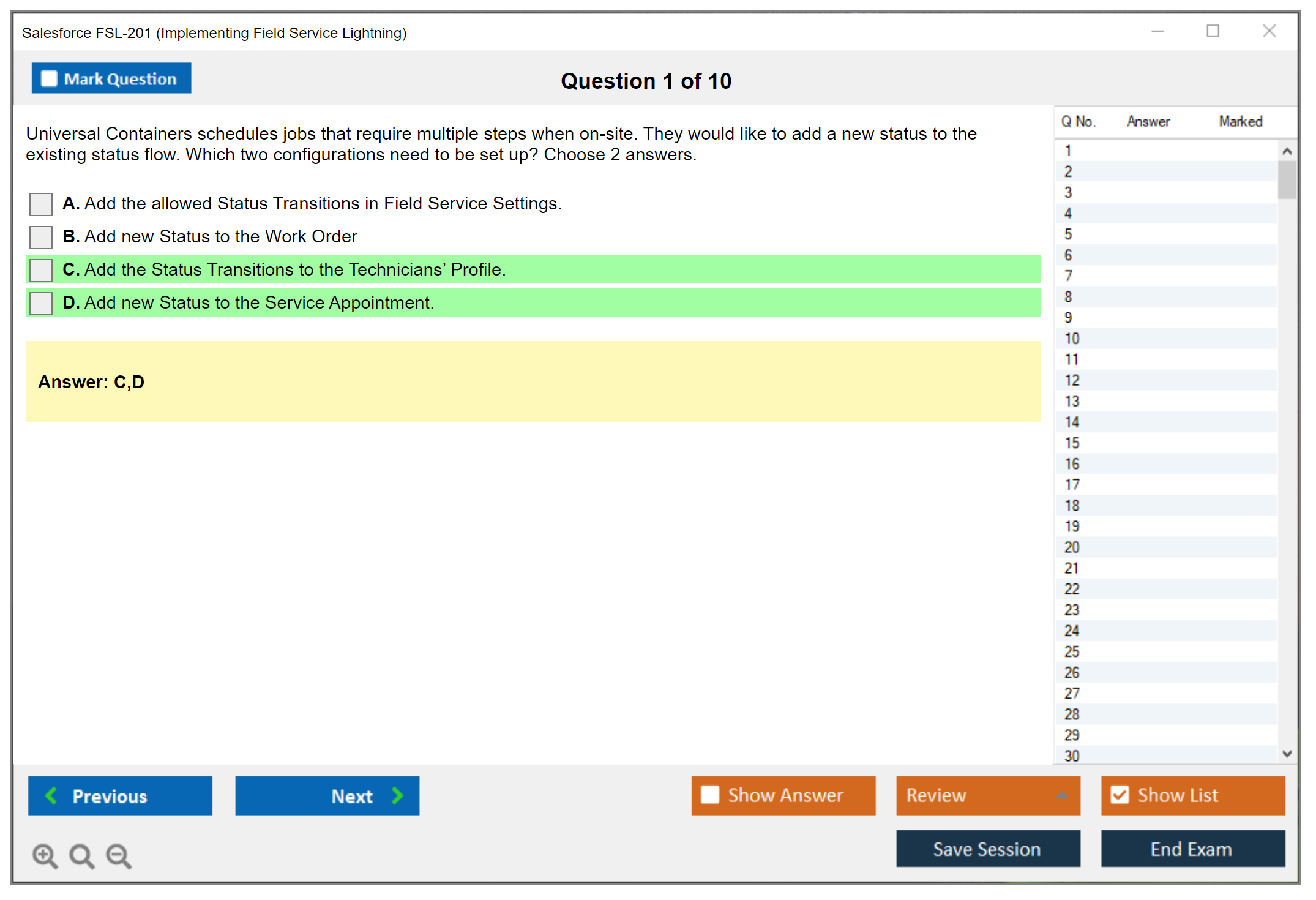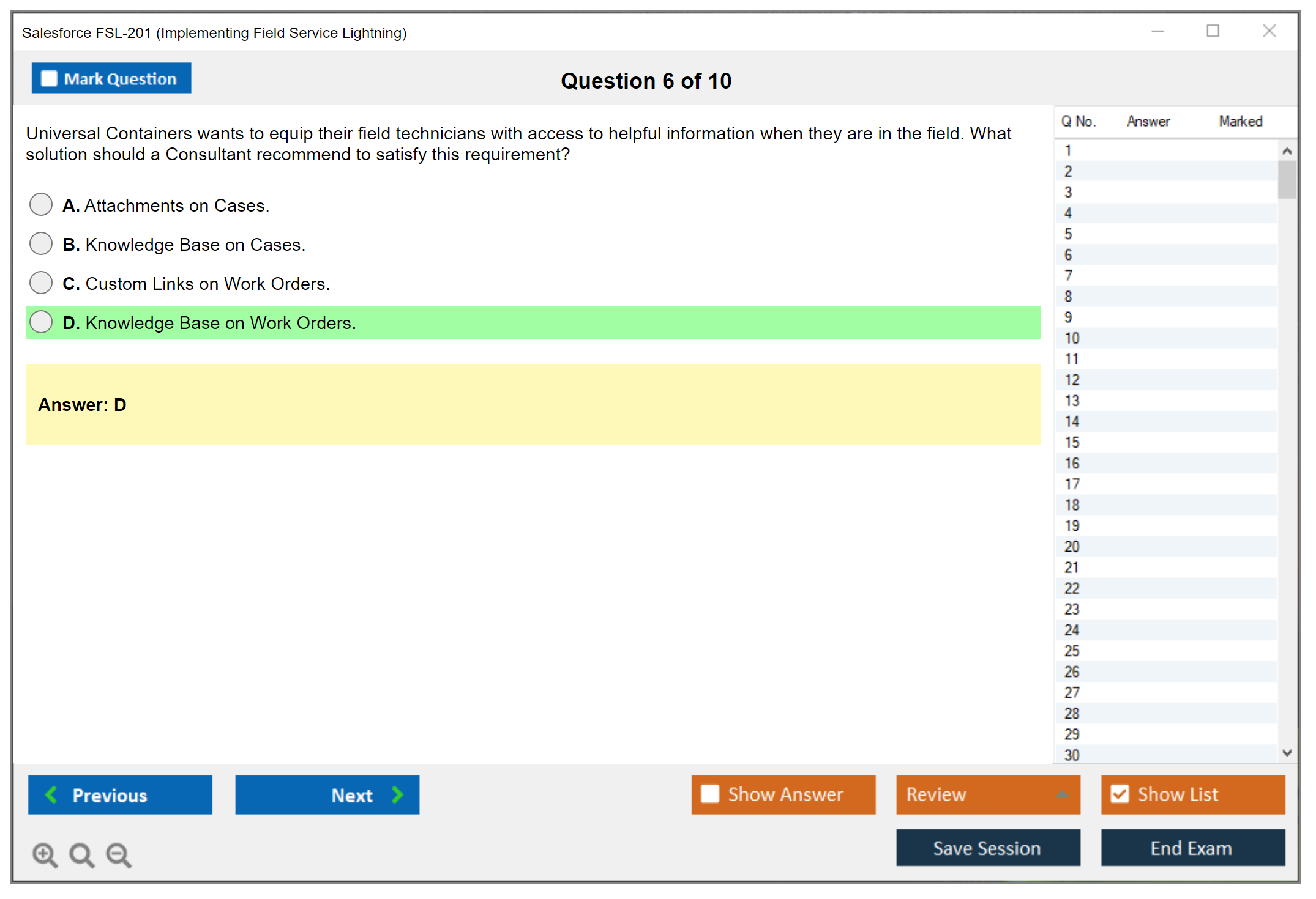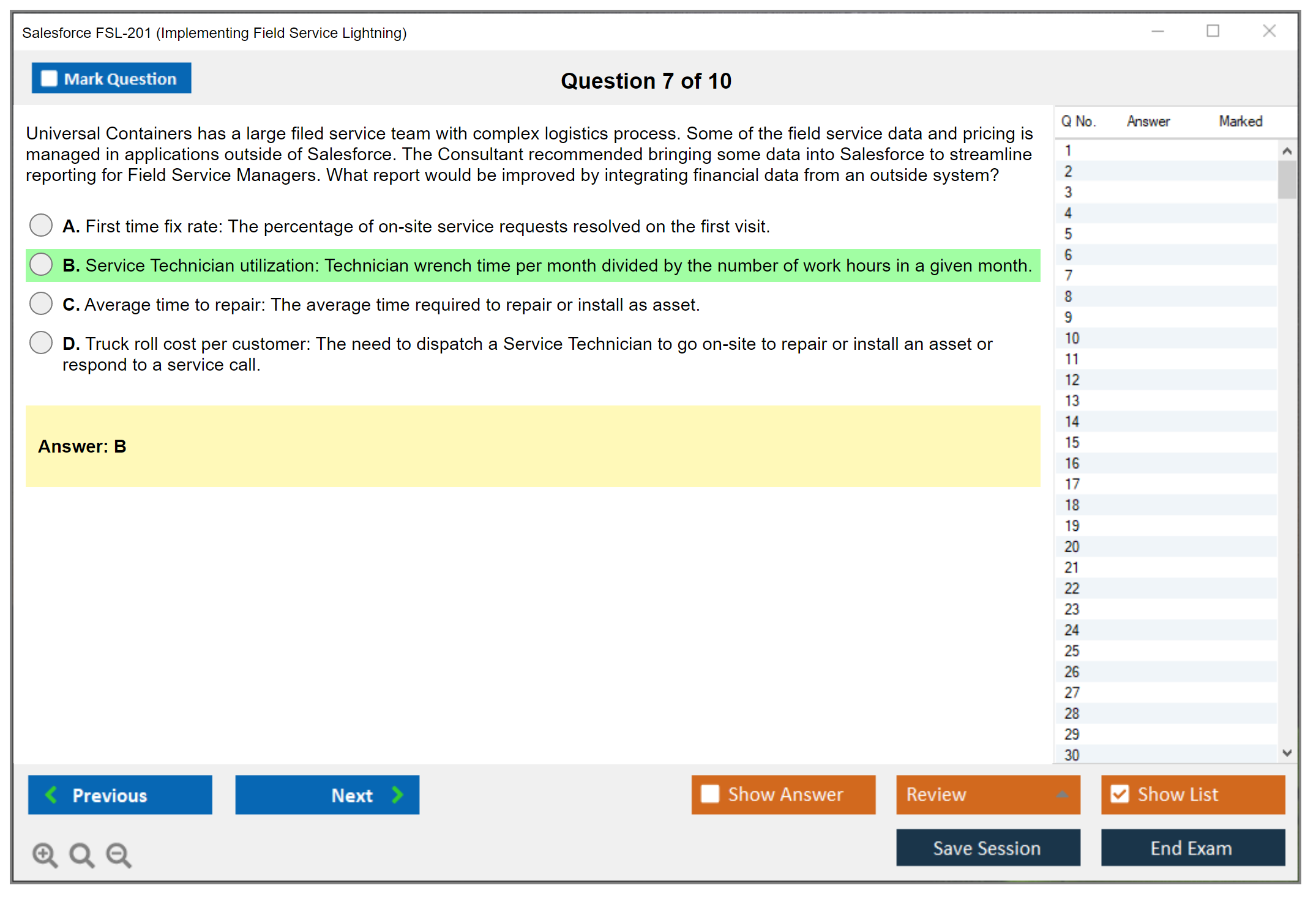The Salesforce FSL-201 (Salesforce - Implementing Field Service Lightning) exam is designed to assess a candidate's knowledge and skills in implementing and managing the Field Service Lightning application. This includes configuring service resources, managing work orders, scheduling and optimizing service appointments, and integrating FSL with other Salesforce applications.