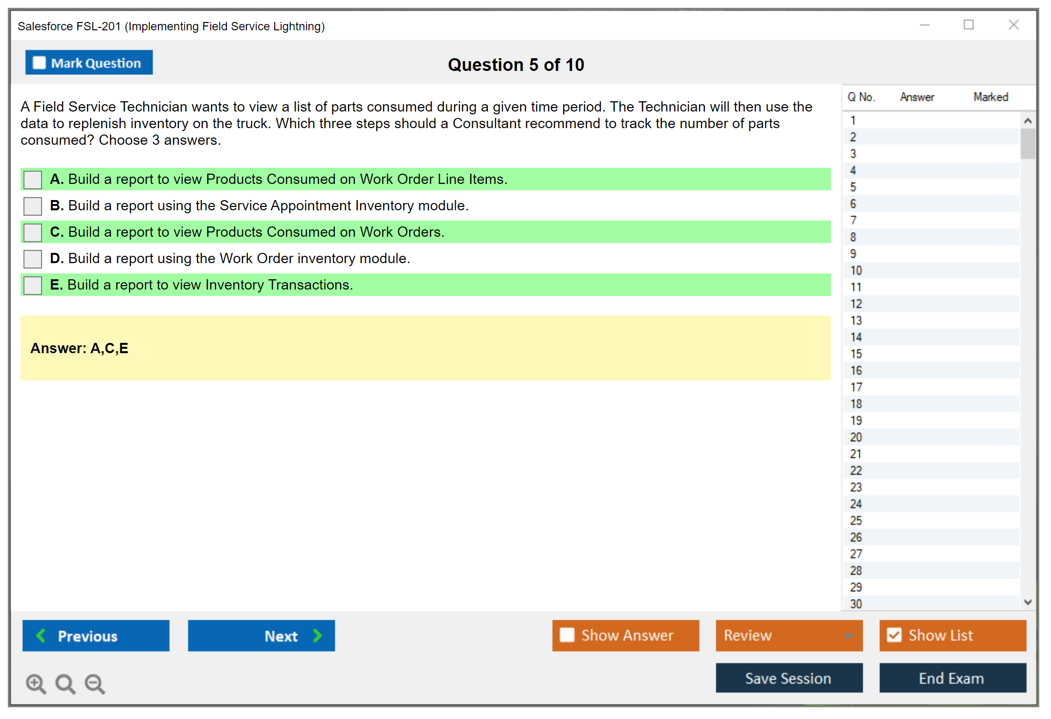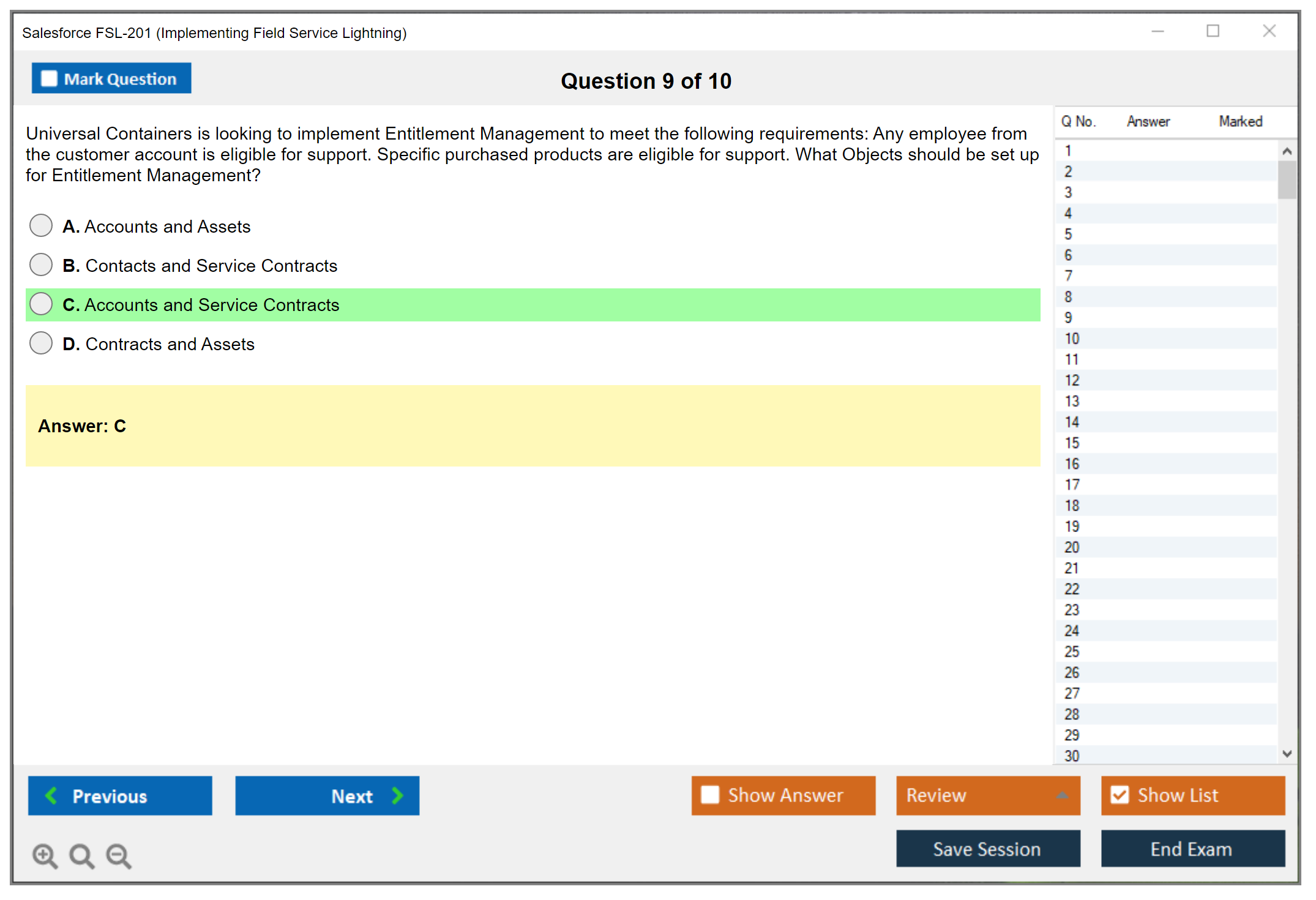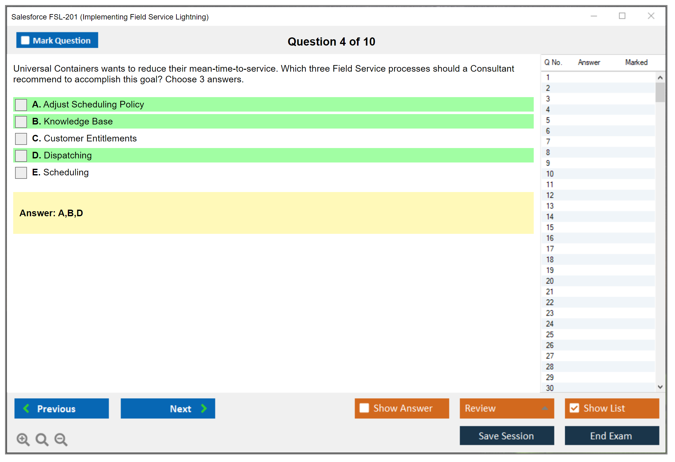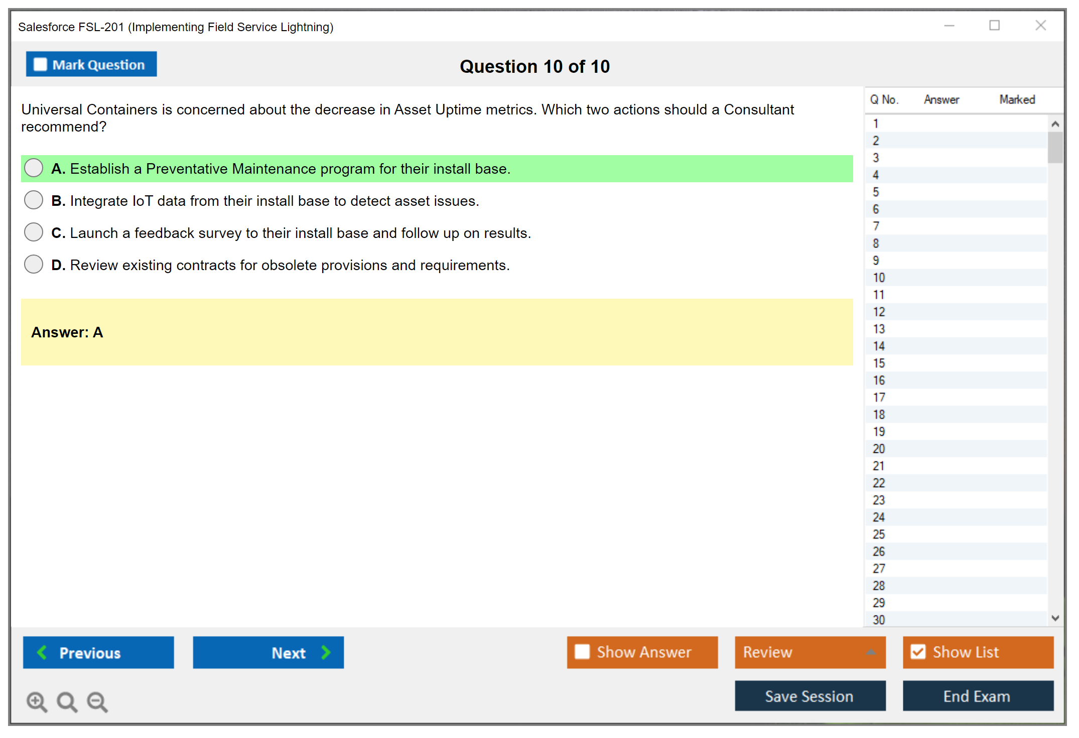 The Salesforce FSL-201 (Salesforce - Implementing Field Service Lightning) exam is designed to assess a candidate's knowledge and skills in implementing and managing the Field Service Lightning application. This includes configuring service resources, managing work orders, scheduling and optimizing service appointments, and integrating FSL with other Salesforce applications.