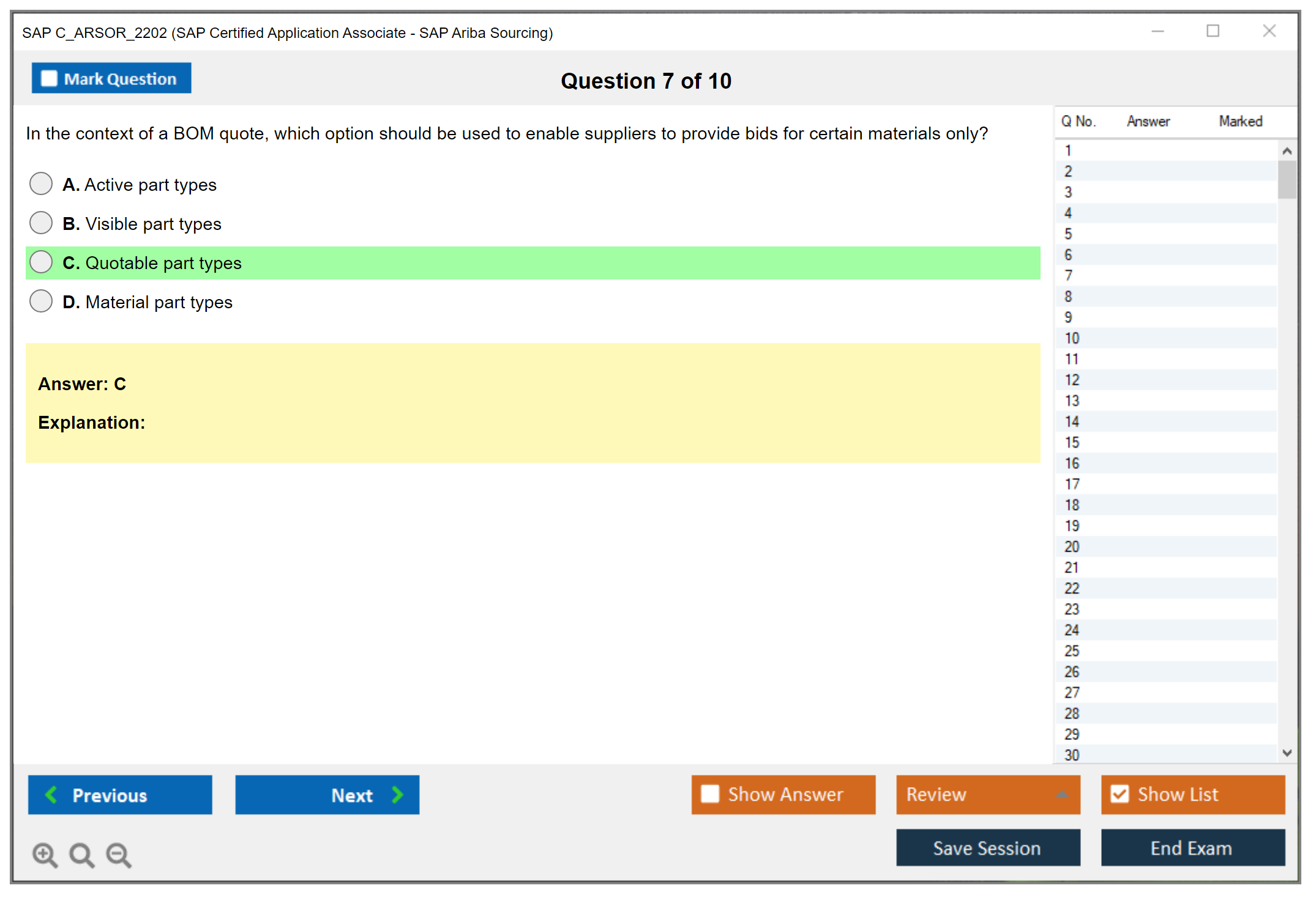 The SAP C_ARSOR_2202 exam is designed to verify the candidate's knowledge and skills in SAP Ariba Sourcing. It covers various aspects of the application, including configuration, integration, and implementation. The exam ensures that the candidate is proficient in using SAP Ariba Sourcing to meet business requirements.