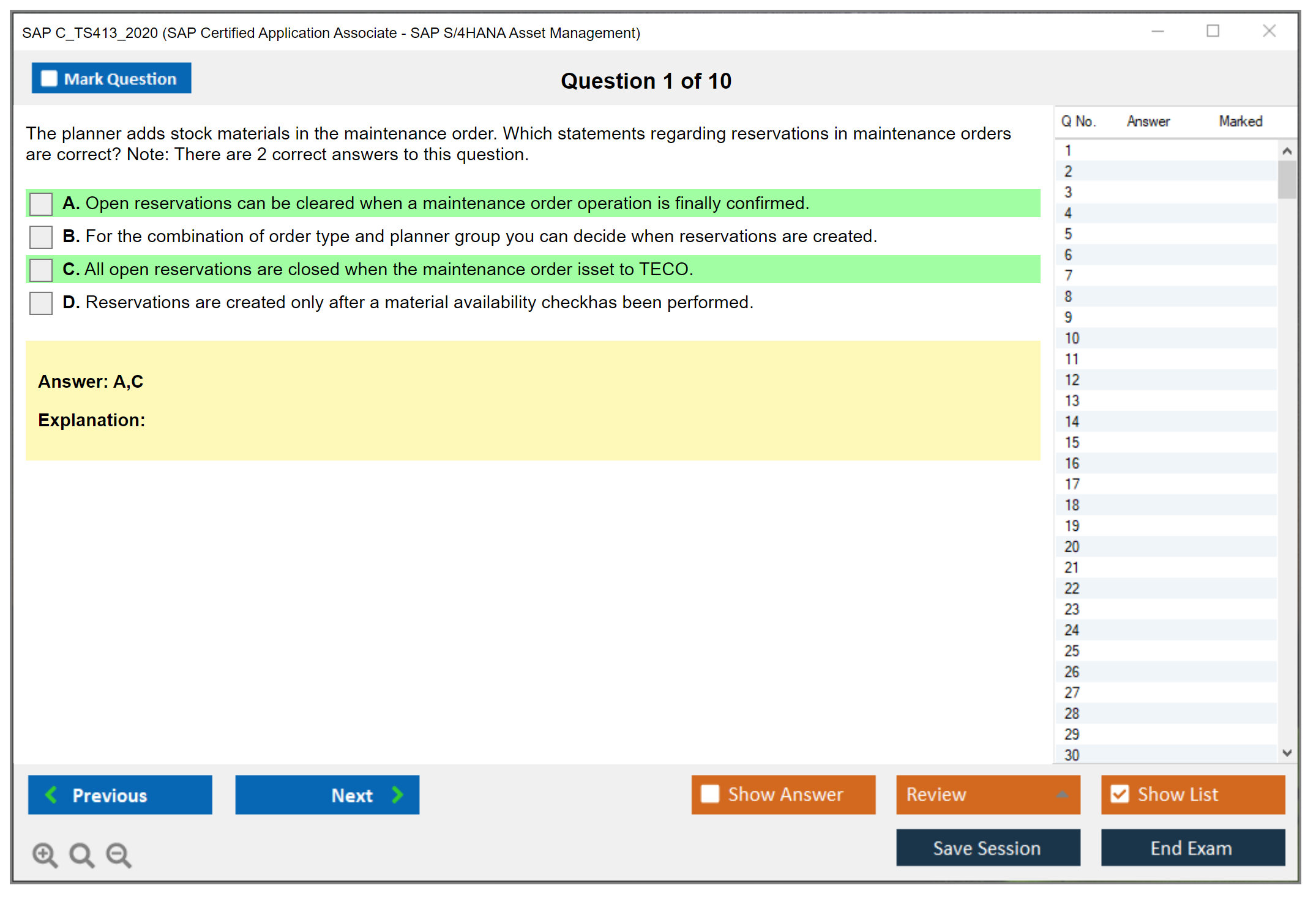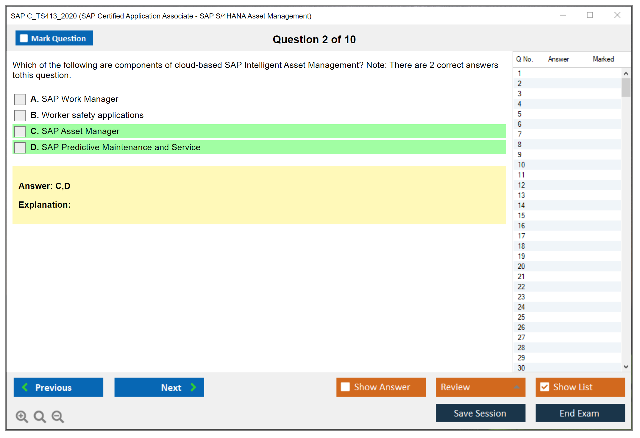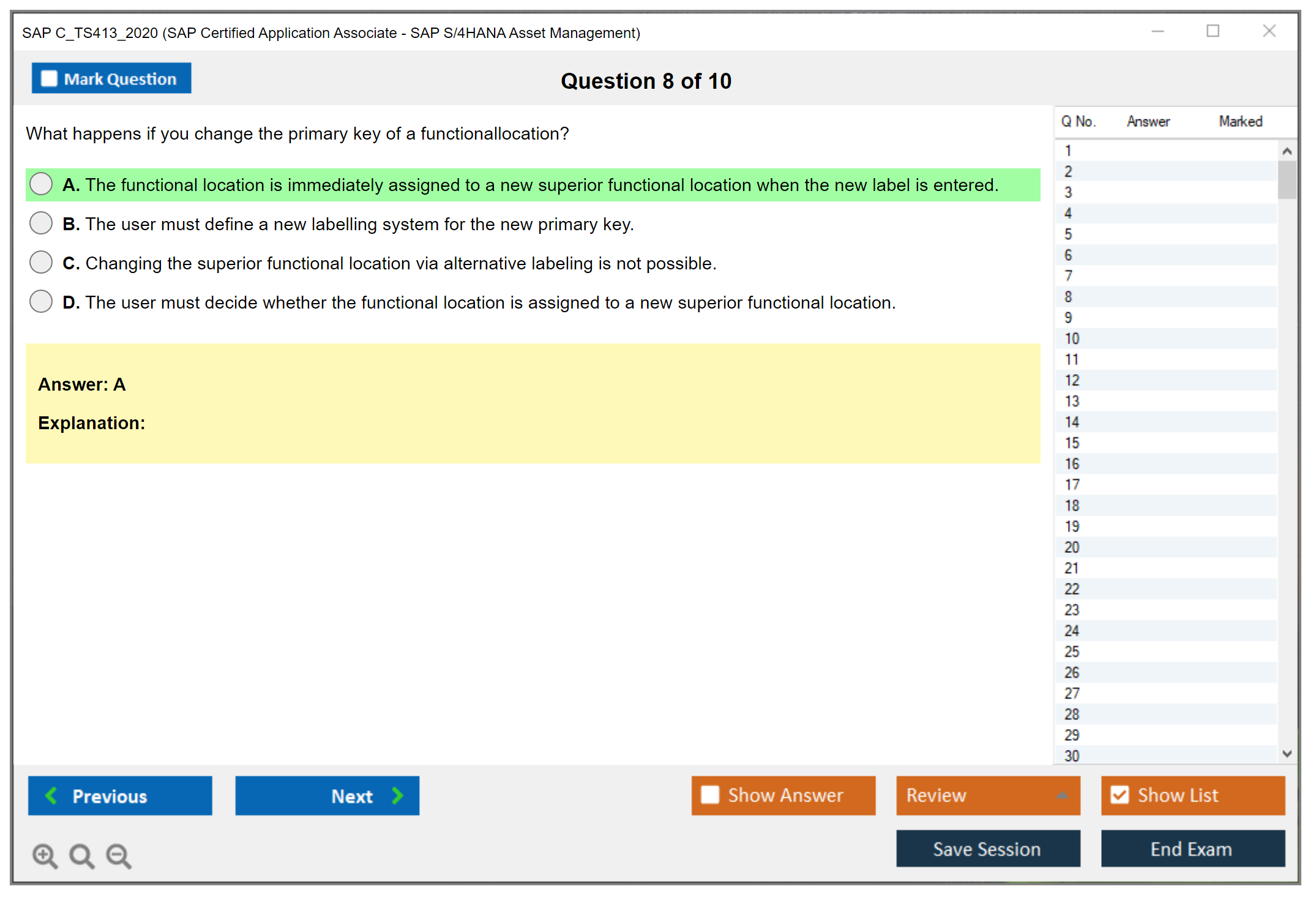 The SAP C_TS413_2020 exam, also known as SAP Certified Application Associate - SAP S/4HANA Asset Management, is designed to validate the candidate's knowledge and skills in the area of SAP S/4HANA Asset Management. This certification proves that the candidate has a fundamental understanding and in-depth technical skills to participate as a member of a project team in a mentored role.