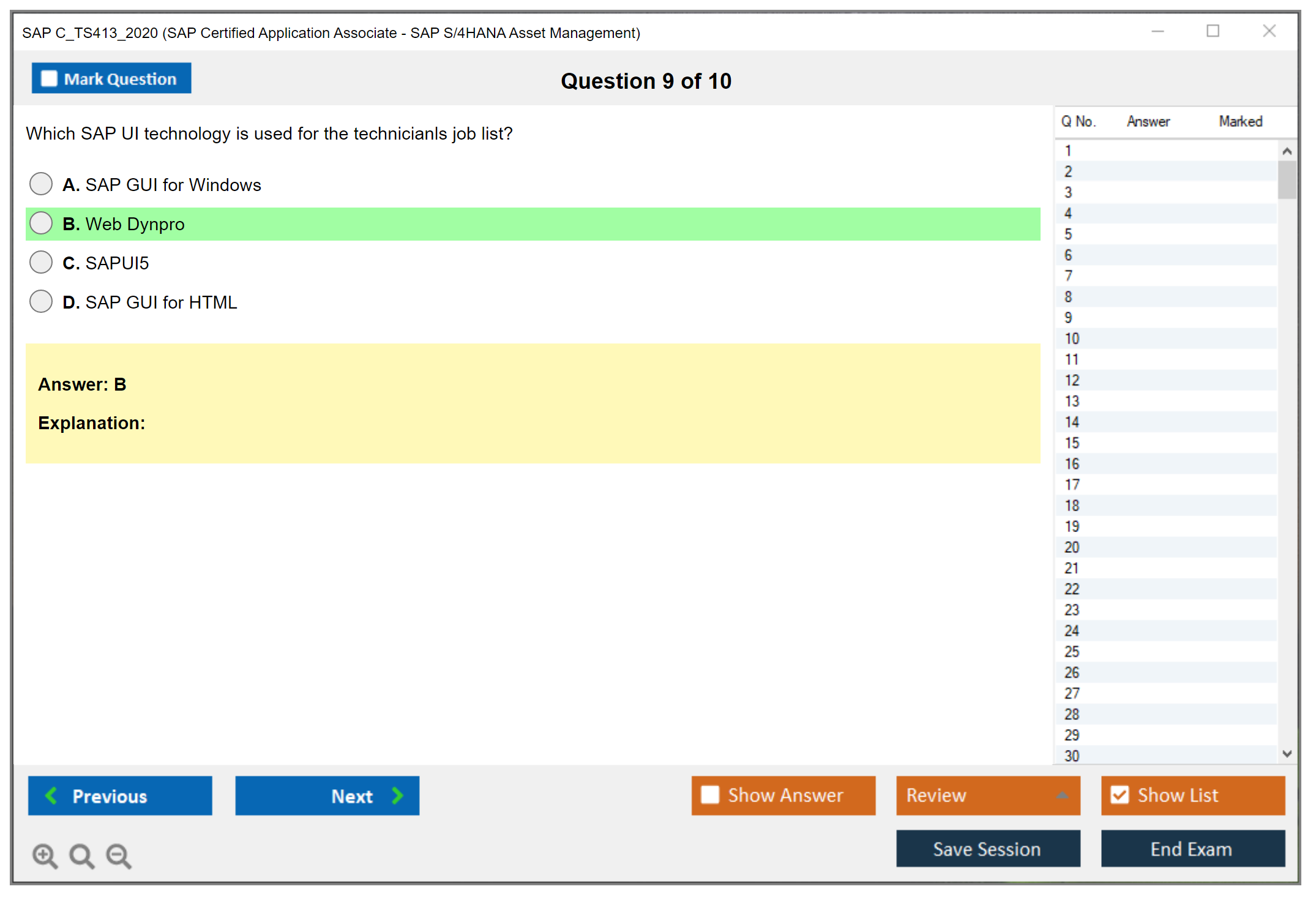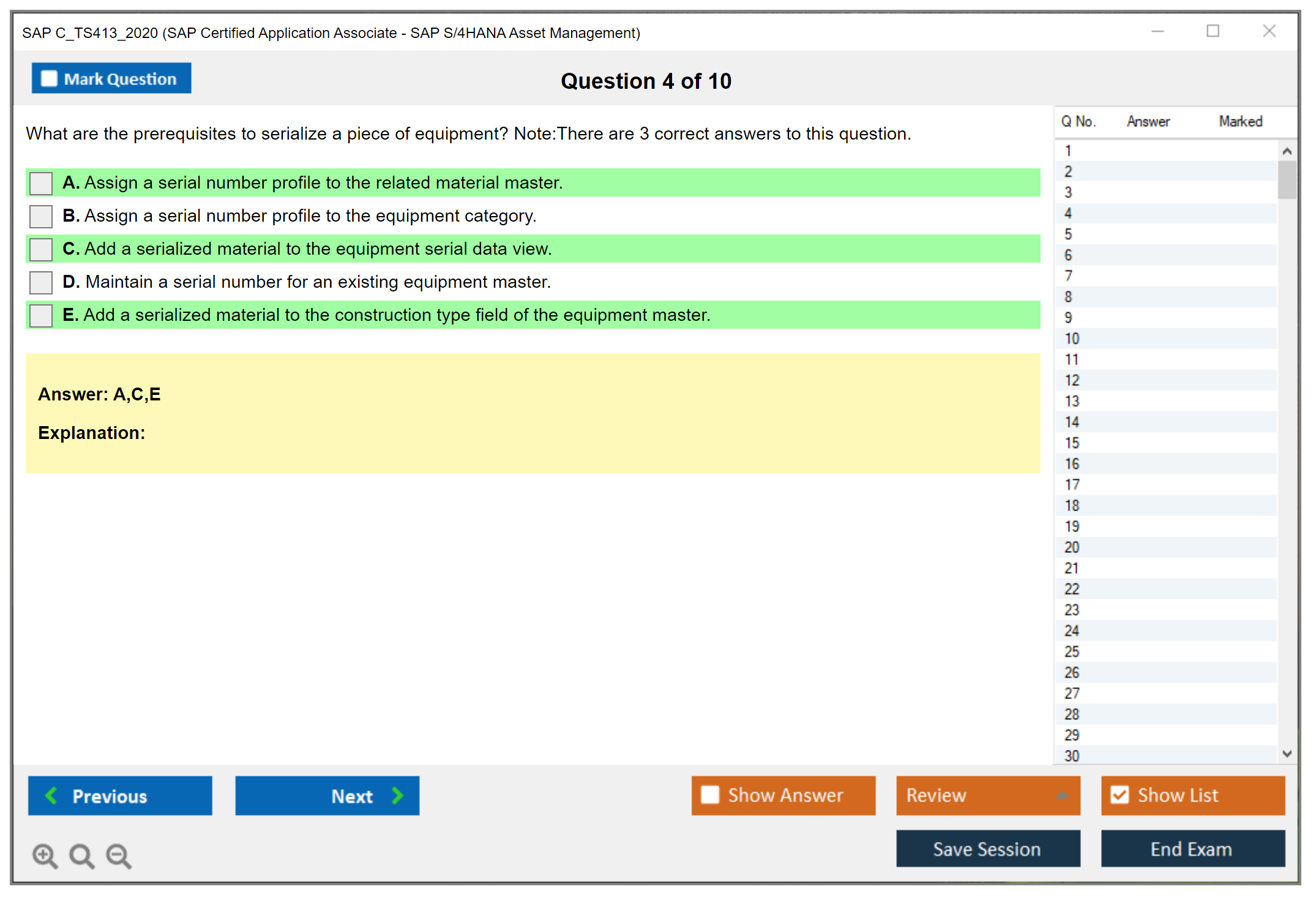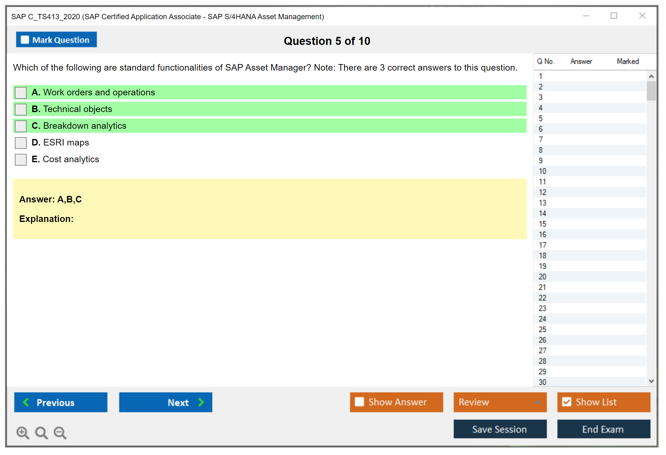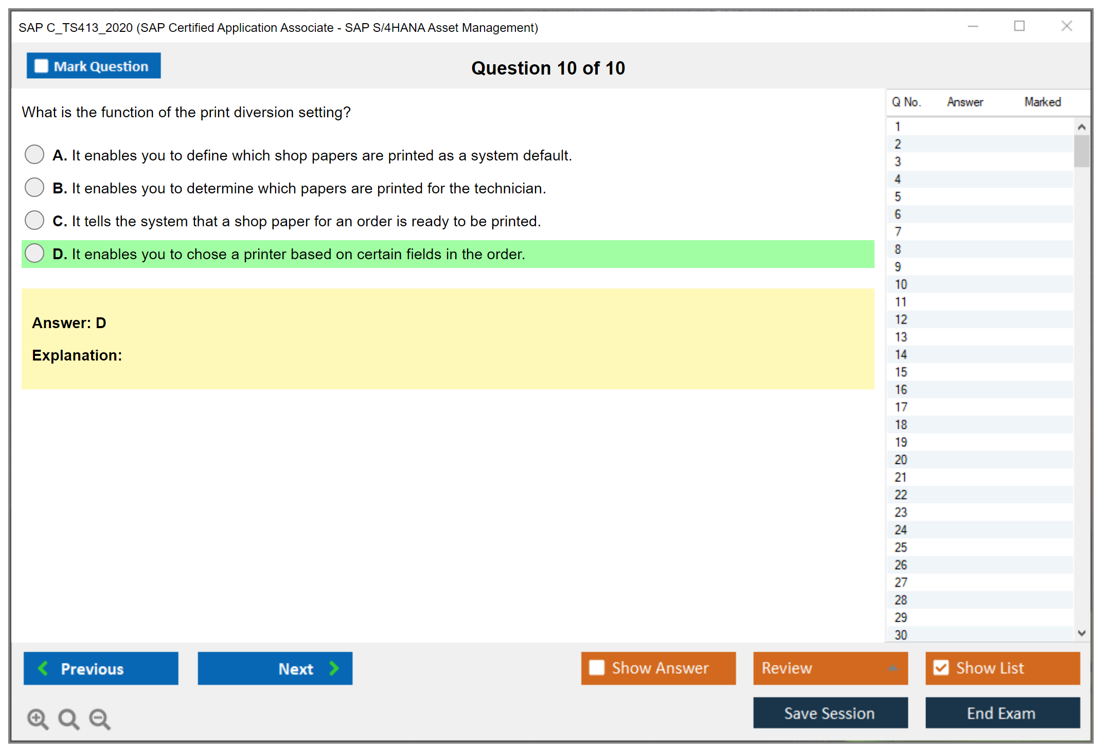 The SAP C_TS413_2020 exam, also known as SAP Certified Application Associate - SAP S/4HANA Asset Management, is designed to validate the candidate's knowledge and skills in the area of SAP S/4HANA Asset Management. This certification proves that the candidate has a fundamental understanding and in-depth technical skills to participate as a member of a project team in a mentored role.