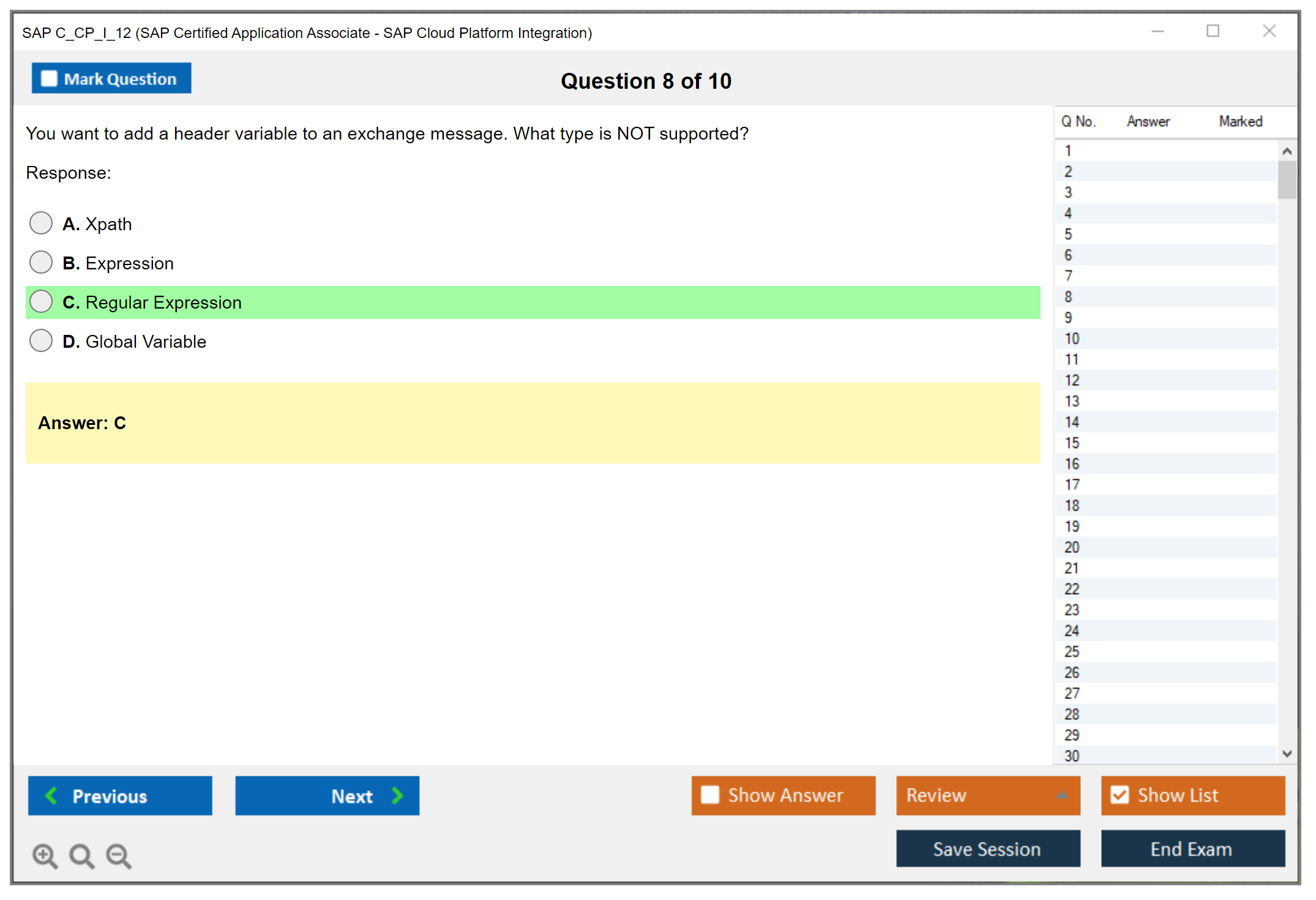 The SAP C_CP_I_12 Exam is intended for individuals who want to demonstrate their expertise in SAP Cloud Platform Integration. It covers various aspects of the integration process, including configuring and managing integration scenarios, using integration patterns, and understanding the architecture of SAP Cloud Platform Integration.