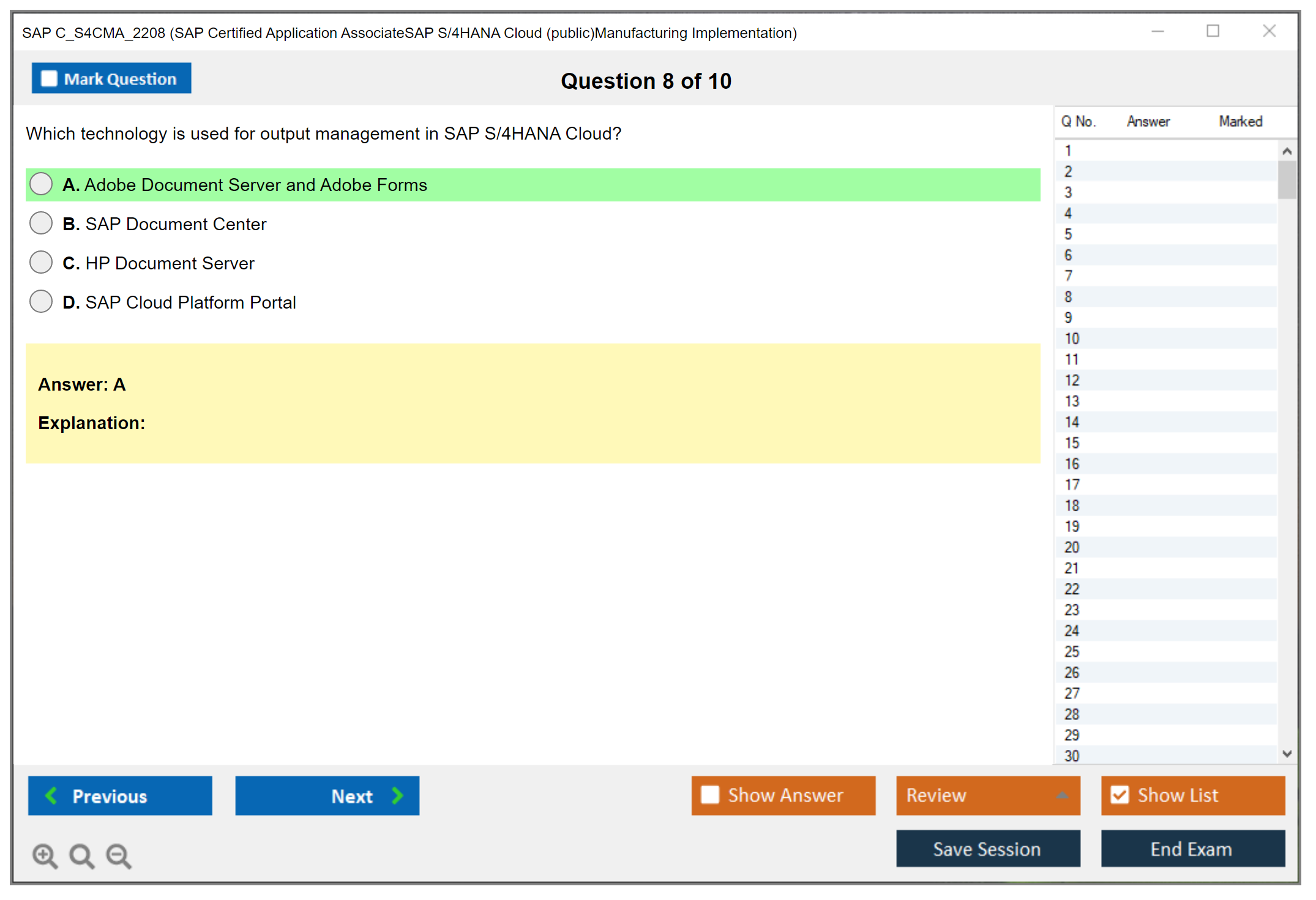 Note: SAP C_S4CMA_2208 (SAP Certified Application AssociateSAP S/4HANA Cloud (public)Manufacturing Implementation) will not receive any new updates.