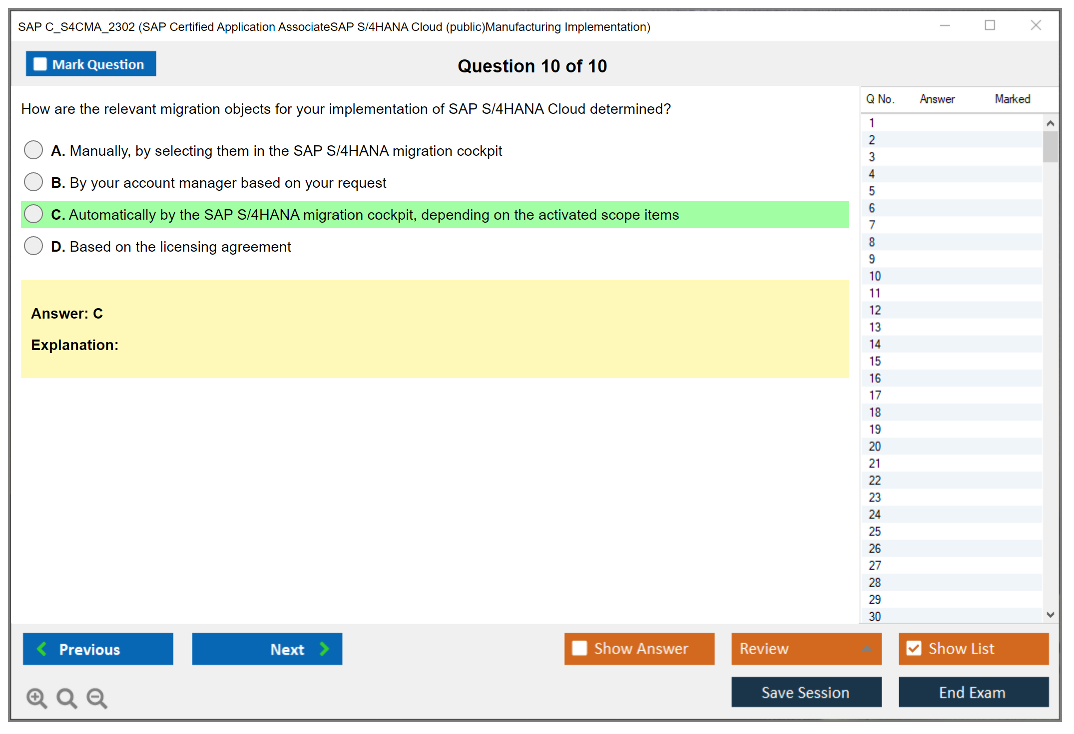 The SAP C_S4CMA_2302 exam is designed to assess the candidate's ability to implement SAP S/4HANA Cloud in the manufacturing domain. It covers various aspects, including configuration, business processes, and integration.