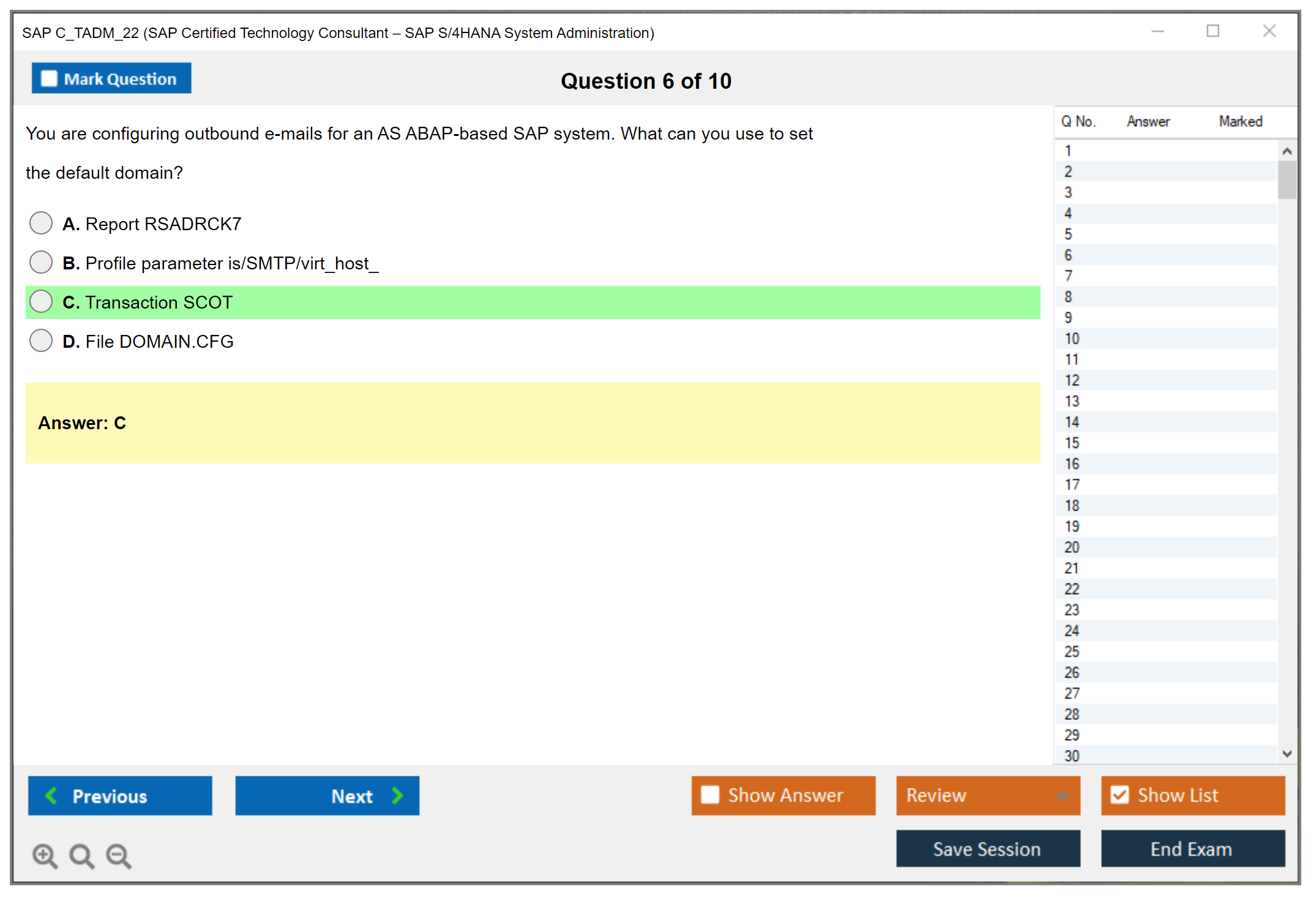 The SAP C_TADM_22 exam, also known as the SAP Certified Technology Consultant – SAP S/4HANA System Administration, is designed to validate the skills and knowledge of candidates in the area of SAP system administration, particularly with SAP S/4HANA. This certification demonstrates that the candidate has a thorough understanding of SAP system architecture, installation, and administration.