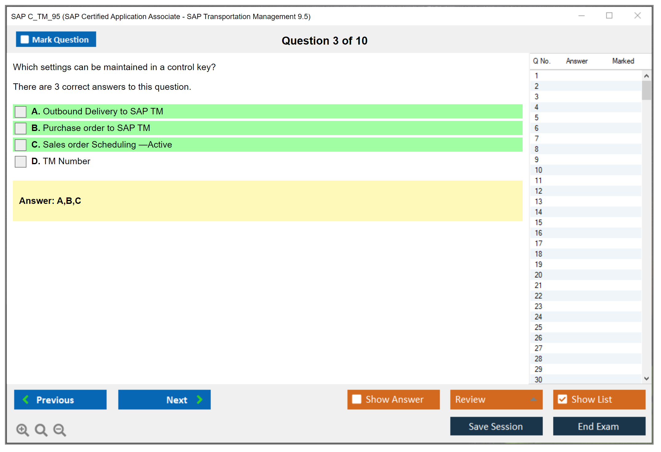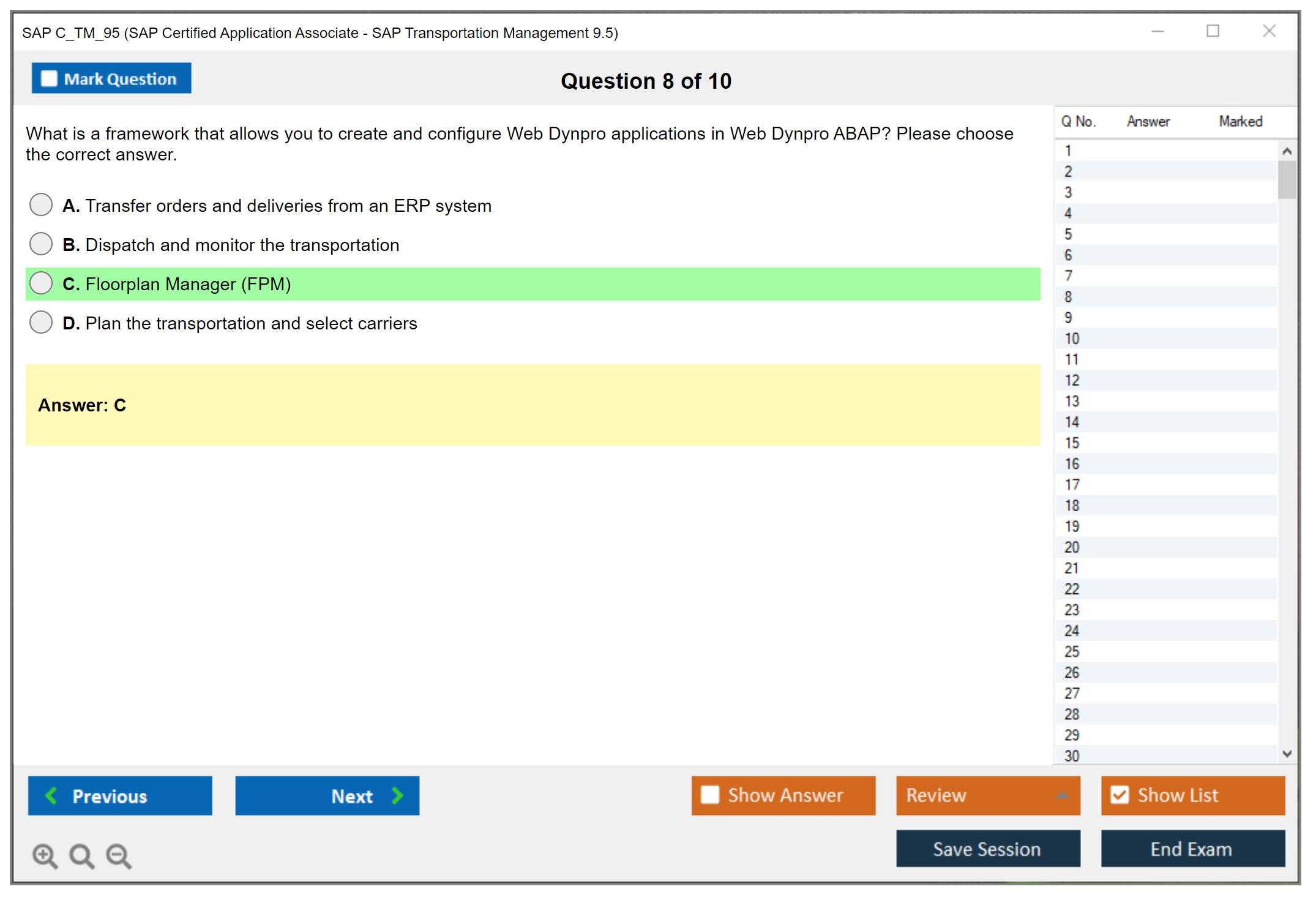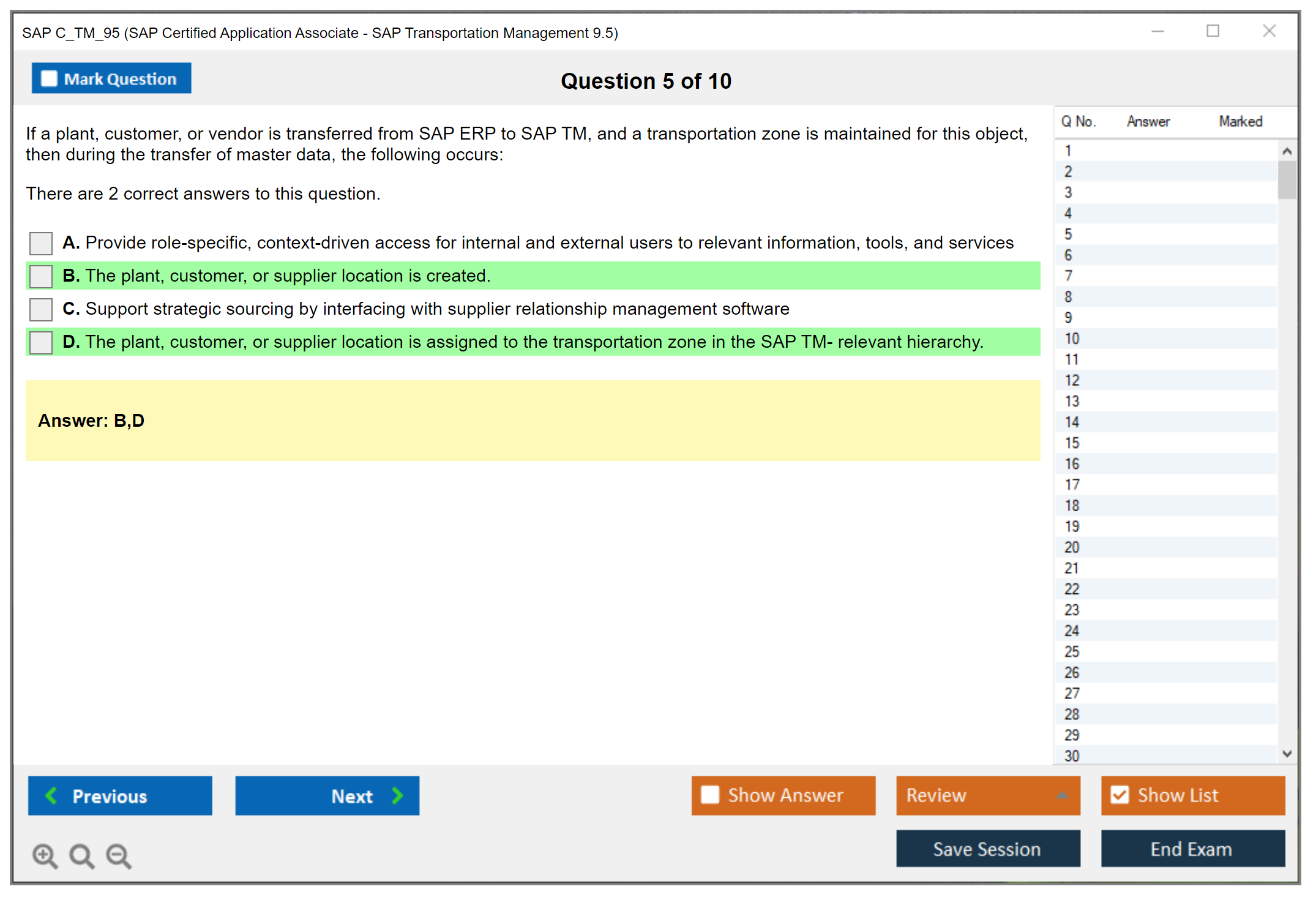 The SAP C_TM_95 (SAP Certified Application Associate - SAP Transportation Management 9.5) Exam is designed to validate the candidate's knowledge and skills in the area of SAP Transportation Management. This certification proves that the candidate has a basic understanding of the solution and can implement it in projects under the guidance of an experienced consultant.