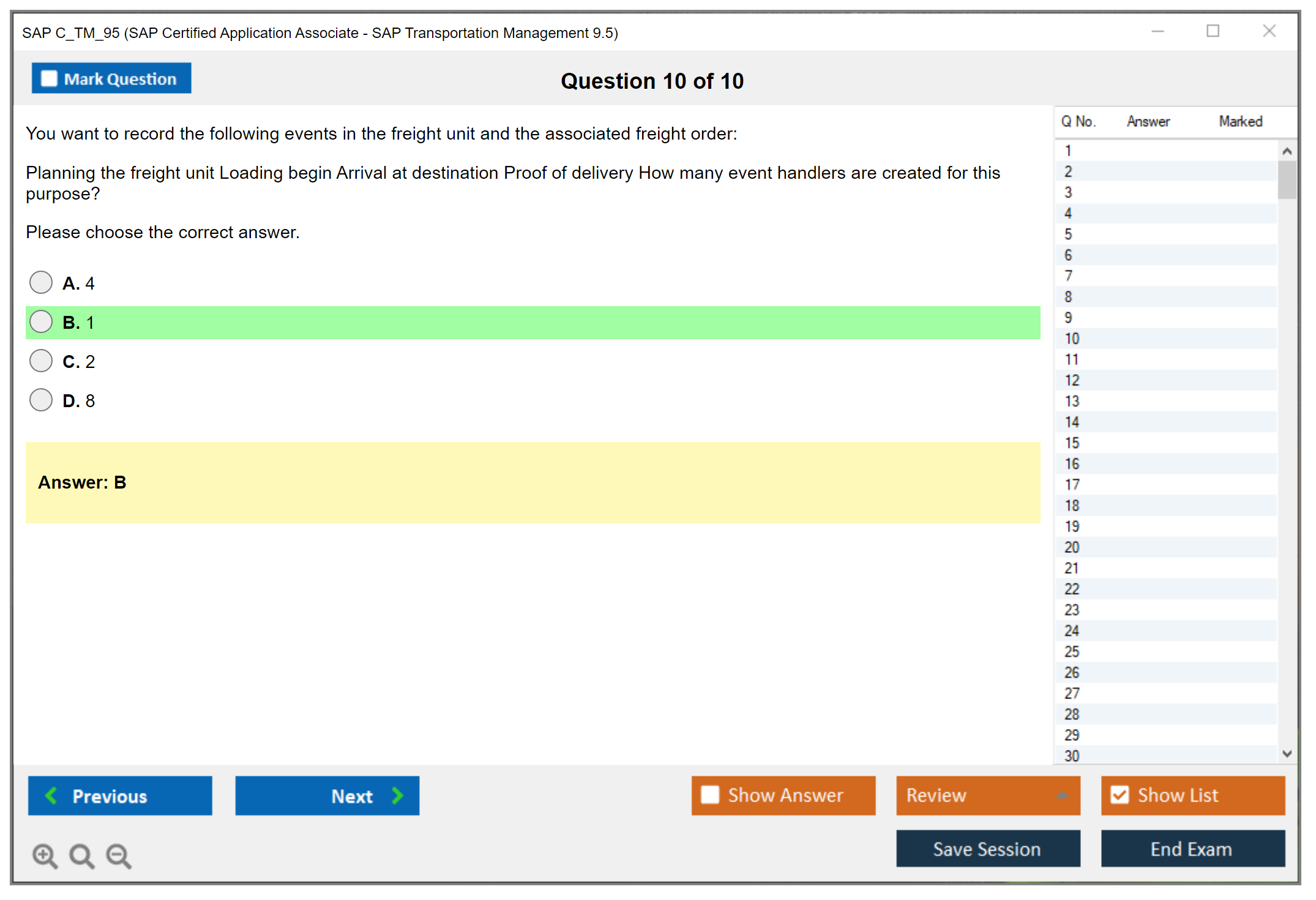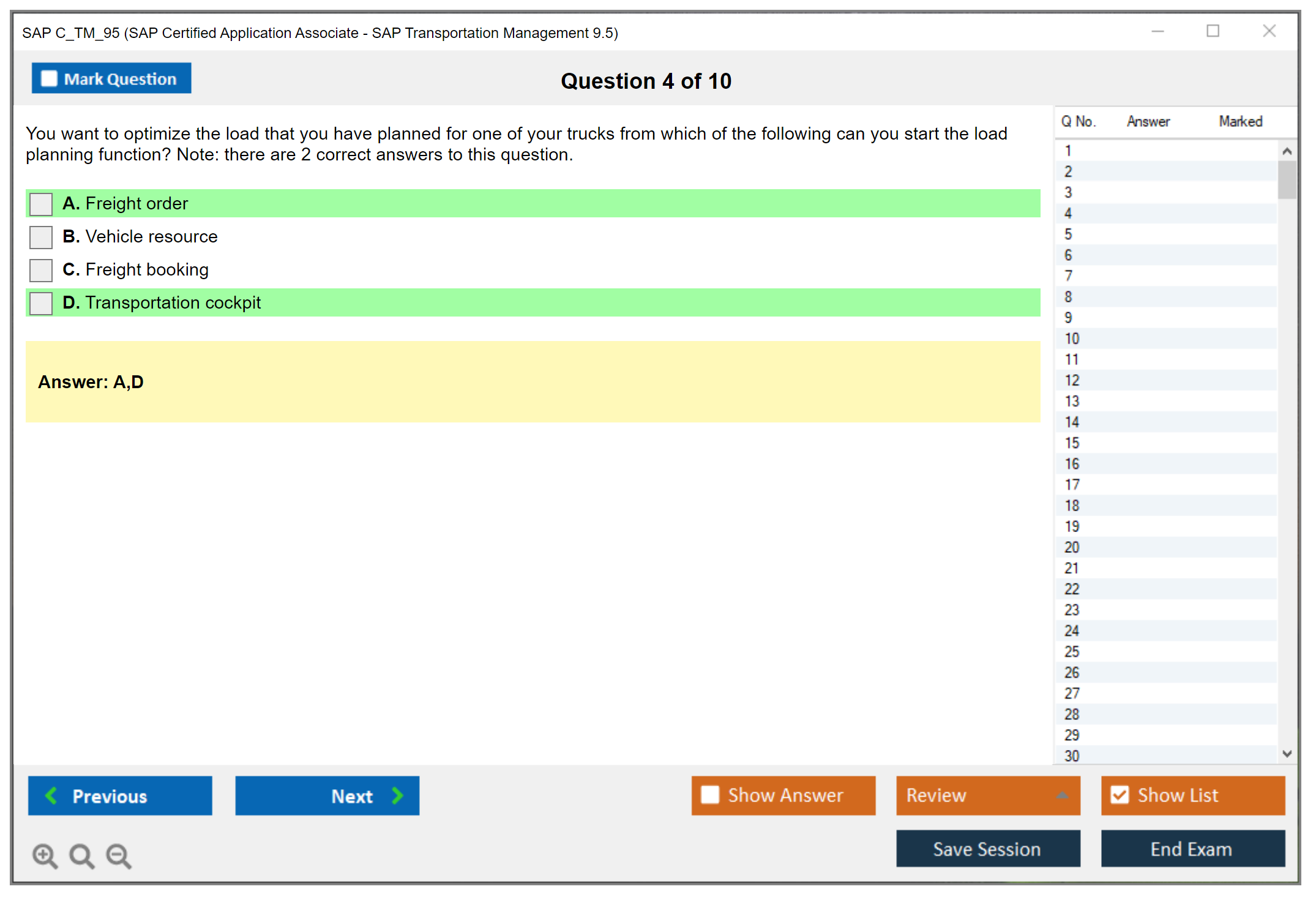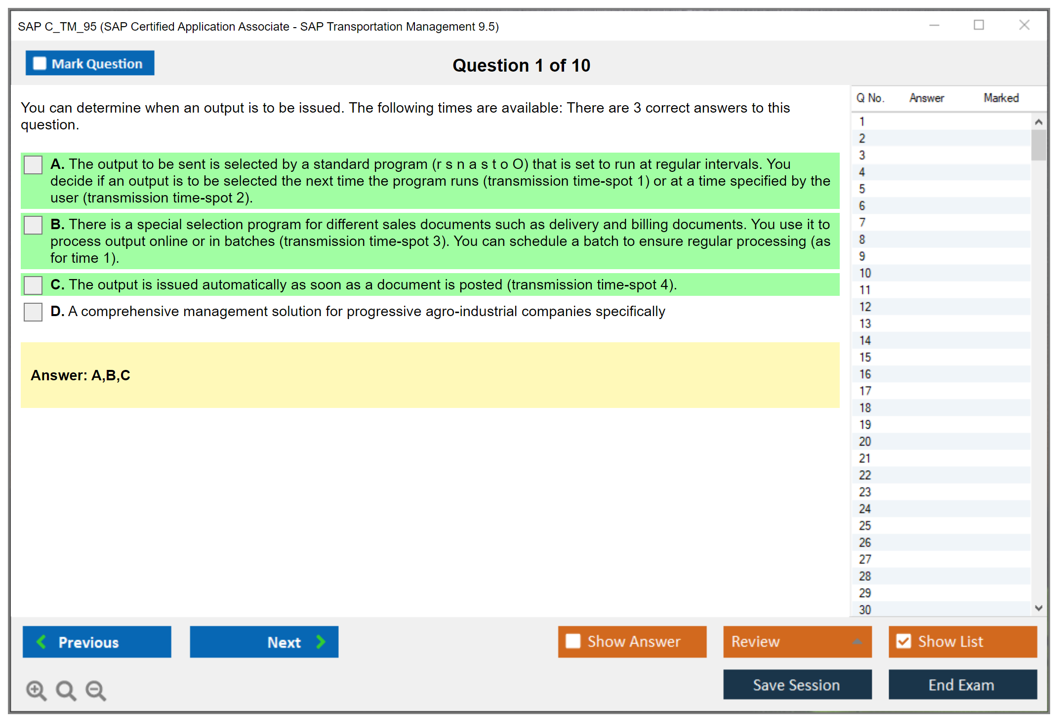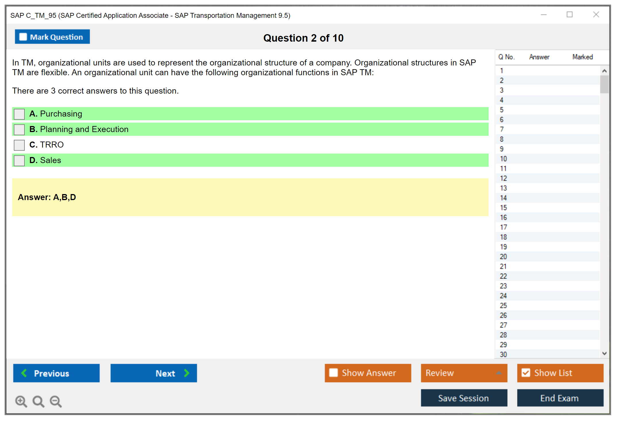 The SAP C_TM_95 (SAP Certified Application Associate - SAP Transportation Management 9.5) Exam is designed to validate the candidate's knowledge and skills in the area of SAP Transportation Management. This certification proves that the candidate has a basic understanding of the solution and can implement it in projects under the guidance of an experienced consultant.