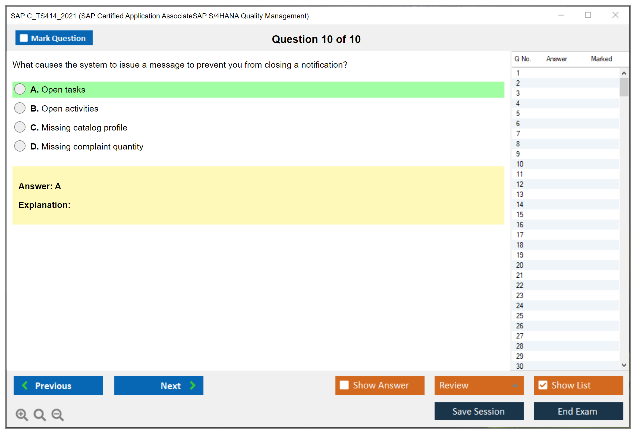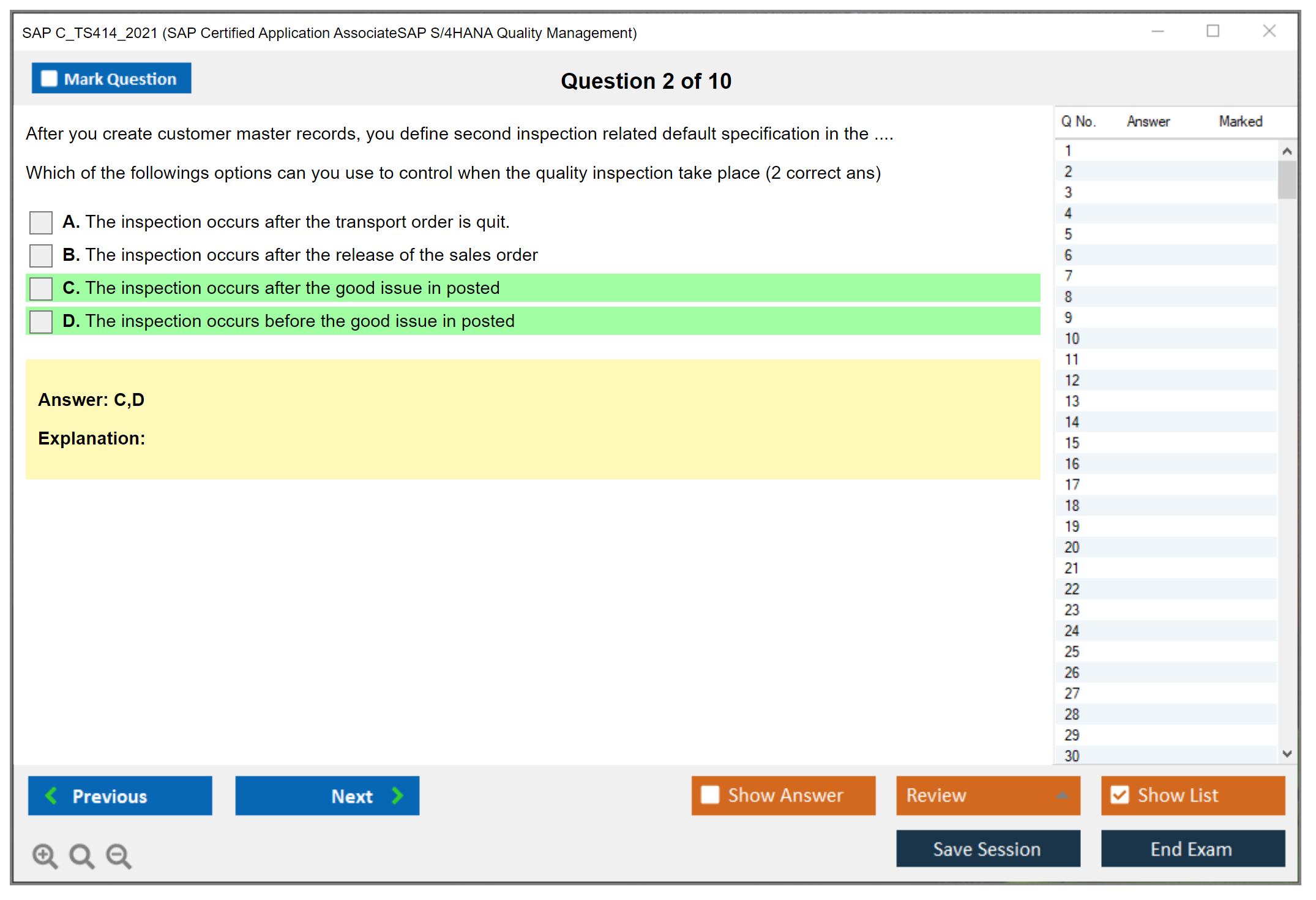 The SAP C_TS414_2021 exam is an associate-level certification that focuses on validating the candidate's knowledge and skills in SAP S/4HANA Quality Management. It tests the candidate's ability to implement and manage quality management processes within the SAP S/4HANA environment.