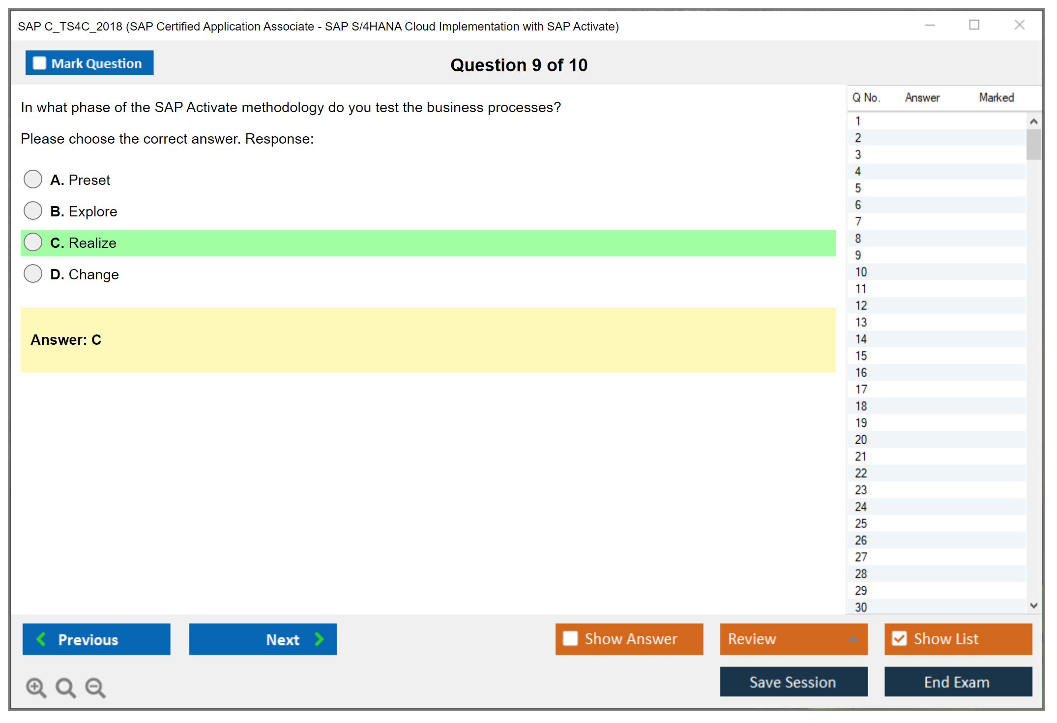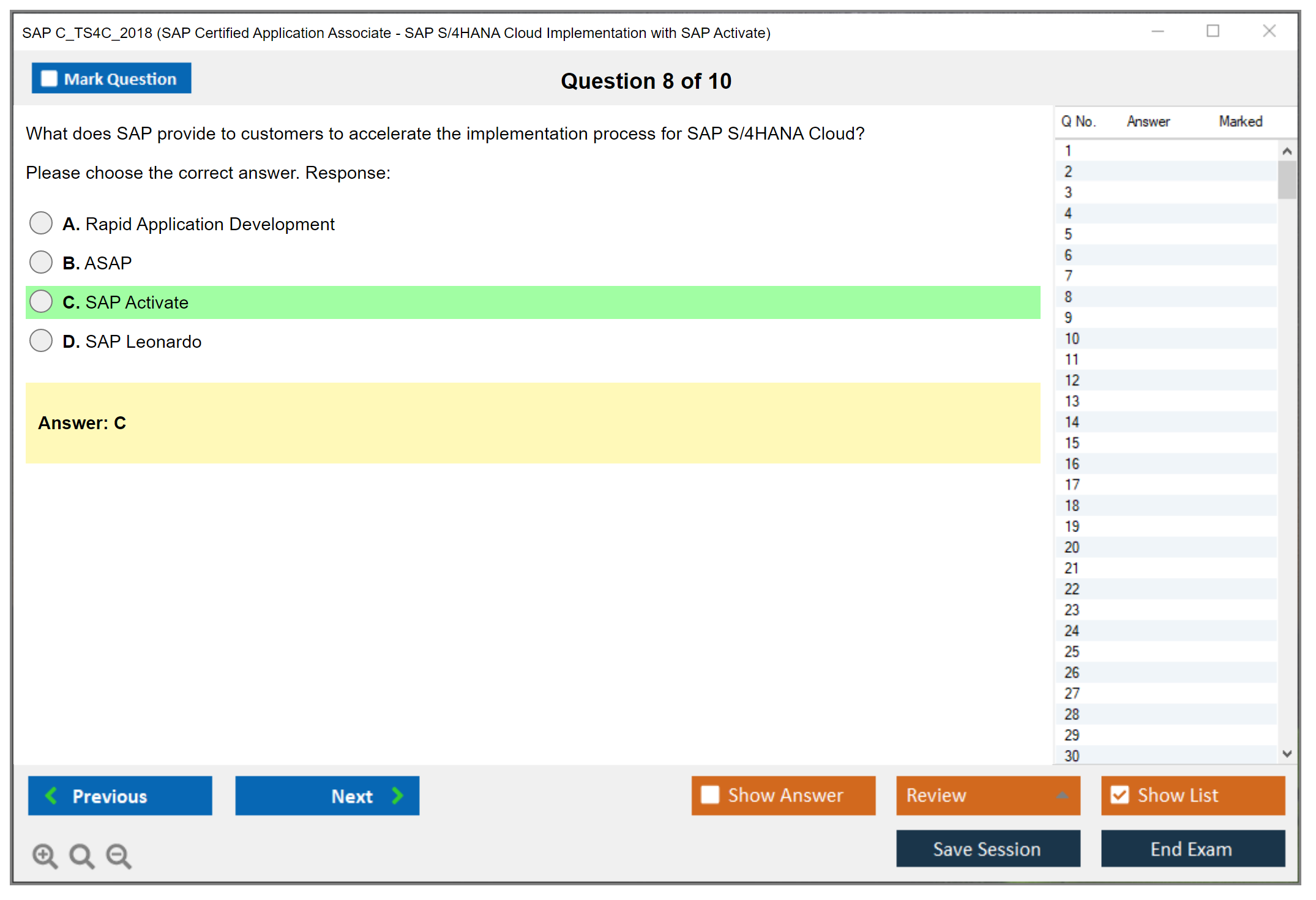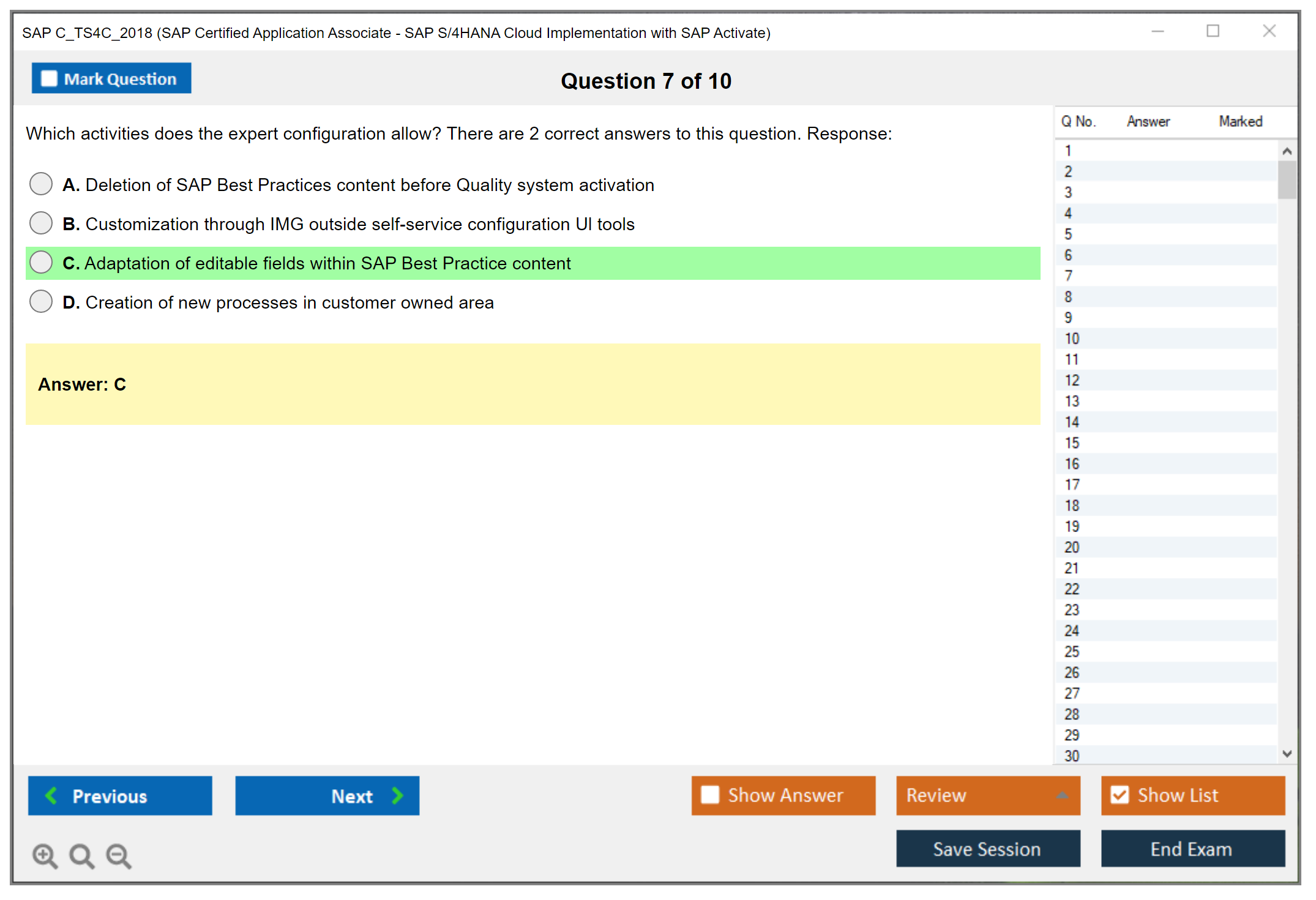 The SAP C_TS4C_2018 exam, also known as the SAP Certified Application Associate - SAP S/4HANA Cloud Implementation with SAP Activate, is designed to validate that the candidate possesses the fundamental and core knowledge required for the SAP S/4HANA Cloud Implementation profile. This certification proves that the candidate has an overall understanding and in-depth technical skills to participate as a member of an SAP S/4HANA Cloud implementation project team with a focus on SAP Activate onboarding, solution adoption, and deployment methodologies.