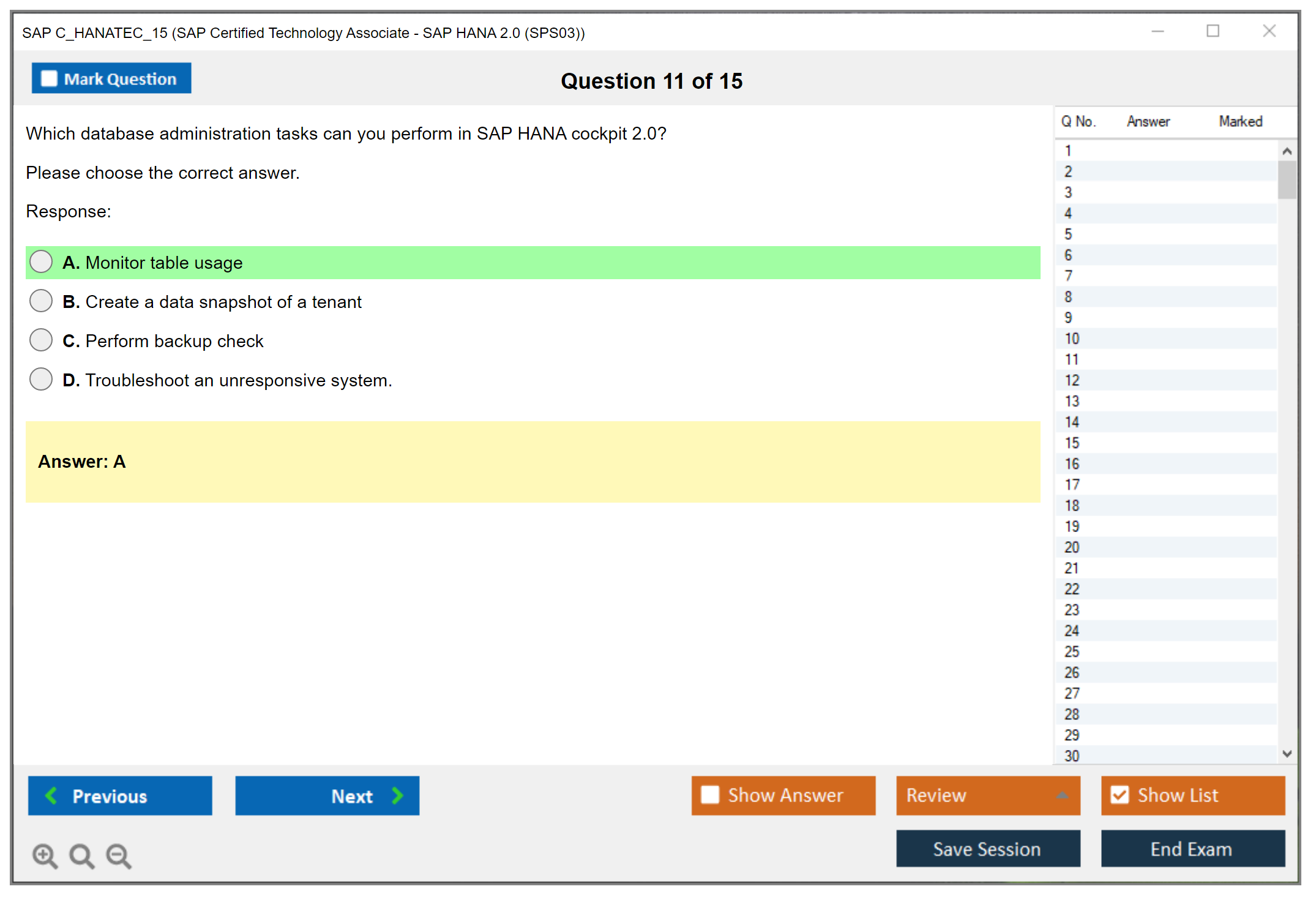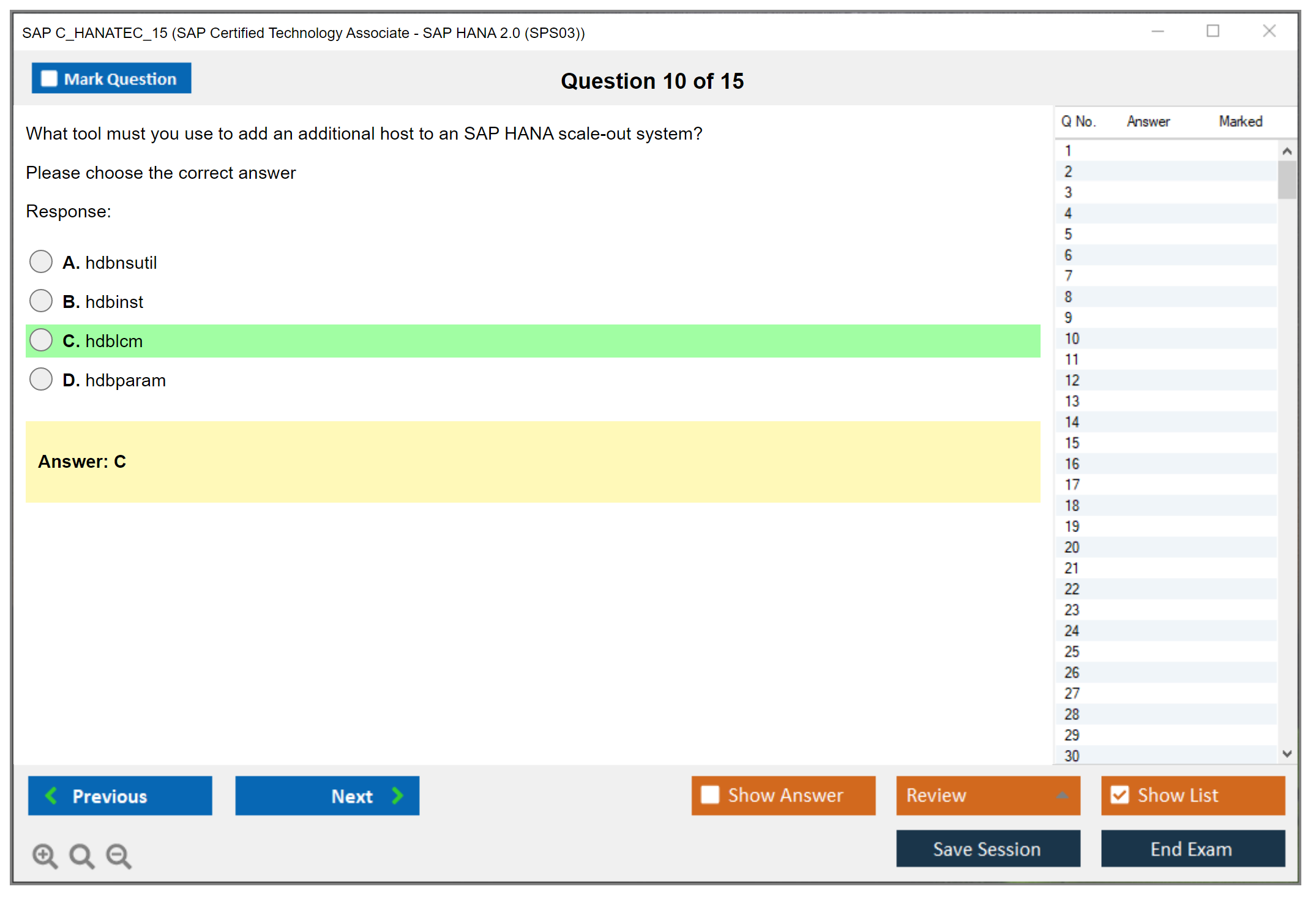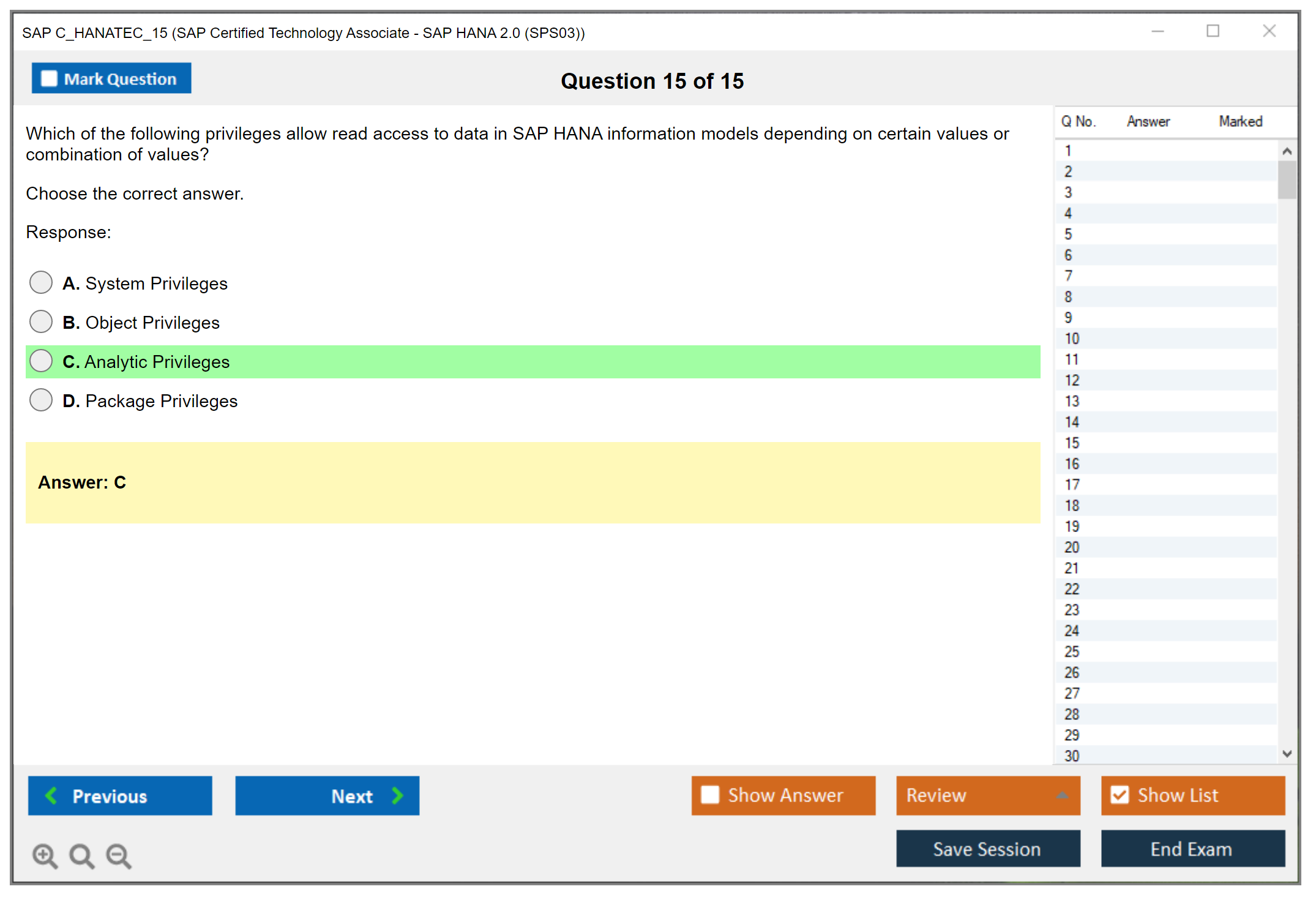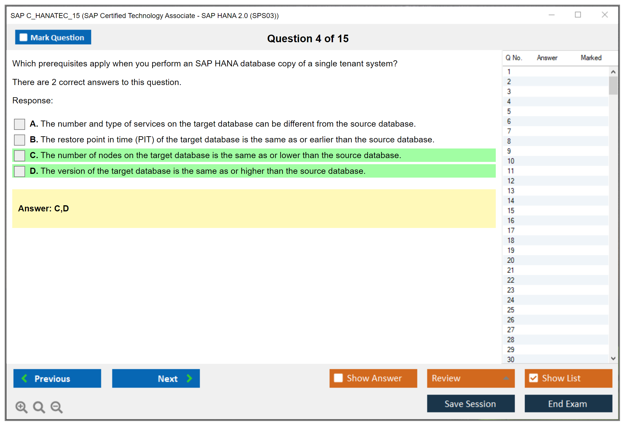 The SAP C_HANATEC_15 exam is a certification test for technology associates to prove their expertise in SAP HANA 2.0 (SPS03). The exam assesses the candidate's ability to perform administrative tasks, manage SAP HANA database, and ensure its optimal performance.