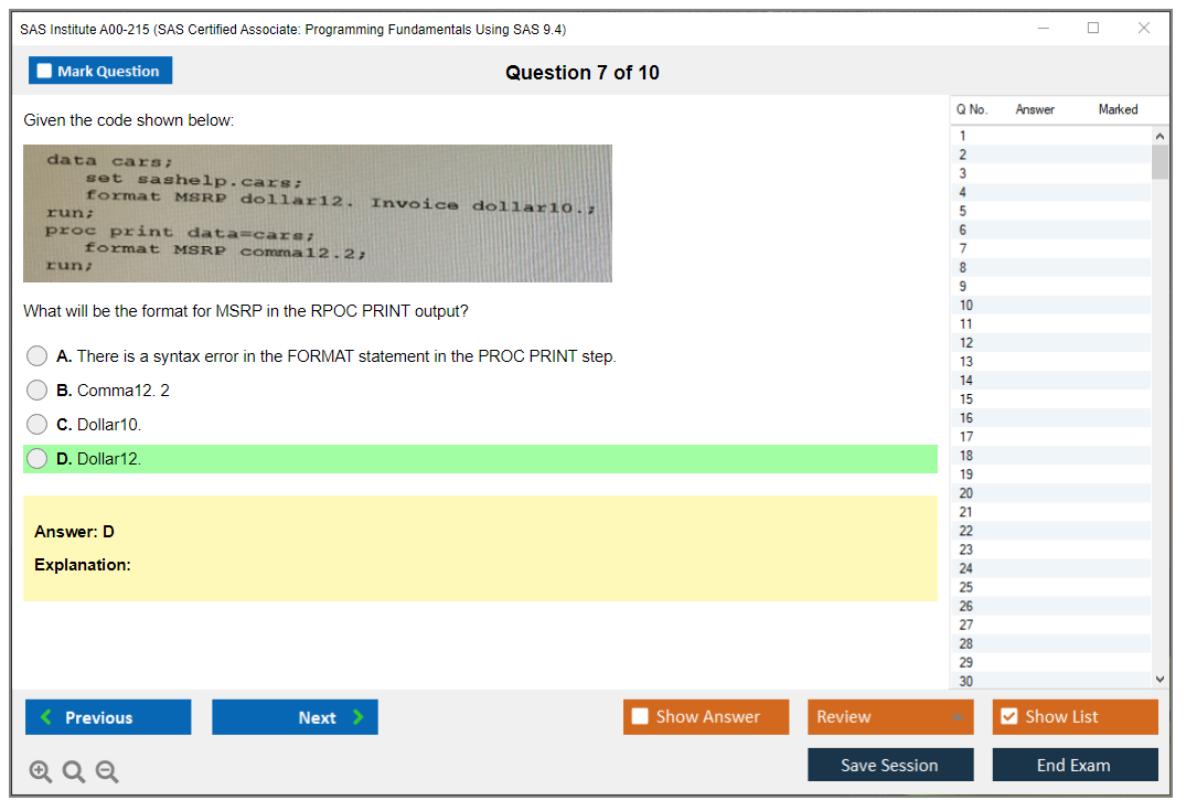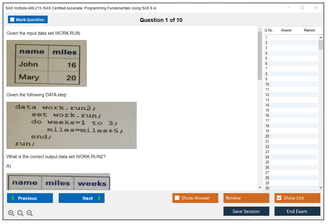 The question format of the SAS Institute A00-215 exam includes multiple-choice and short-answer questions.