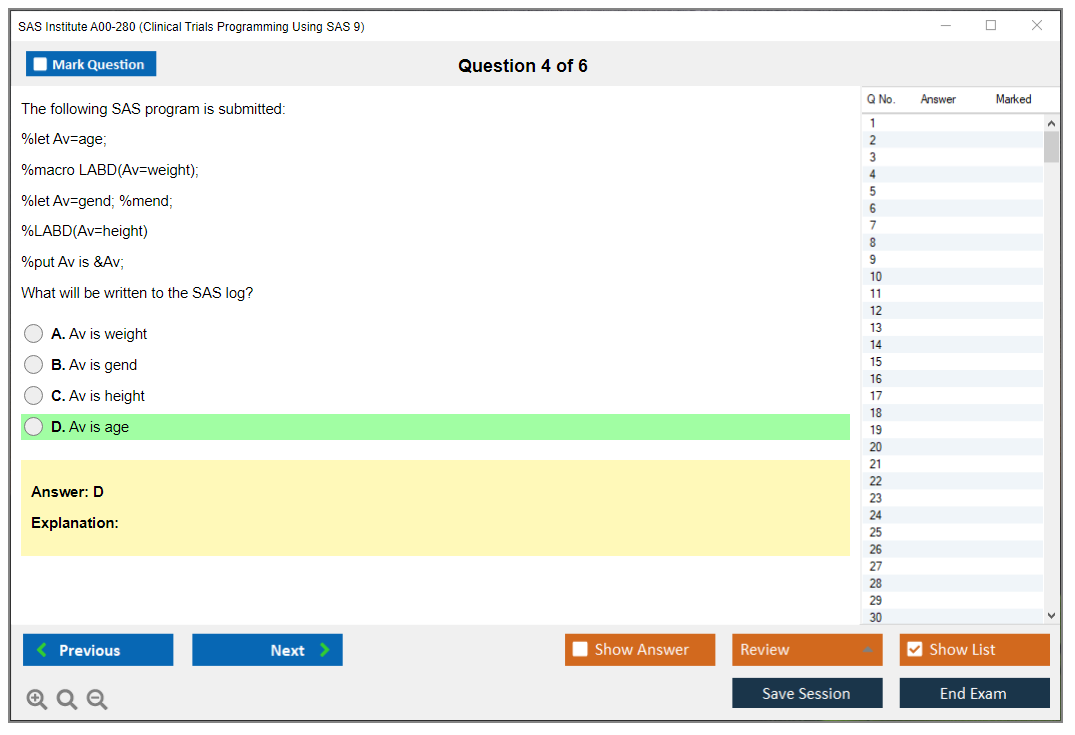 The SAS Institute A00-280 exam, also known as Clinical Trials Programming Using SAS 9, is designed to test the knowledge and skills of individuals in using SAS software to perform clinical trials programming. This certification validates the ability to use SAS tools and techniques in the context of clinical trials data analysis and reporting.