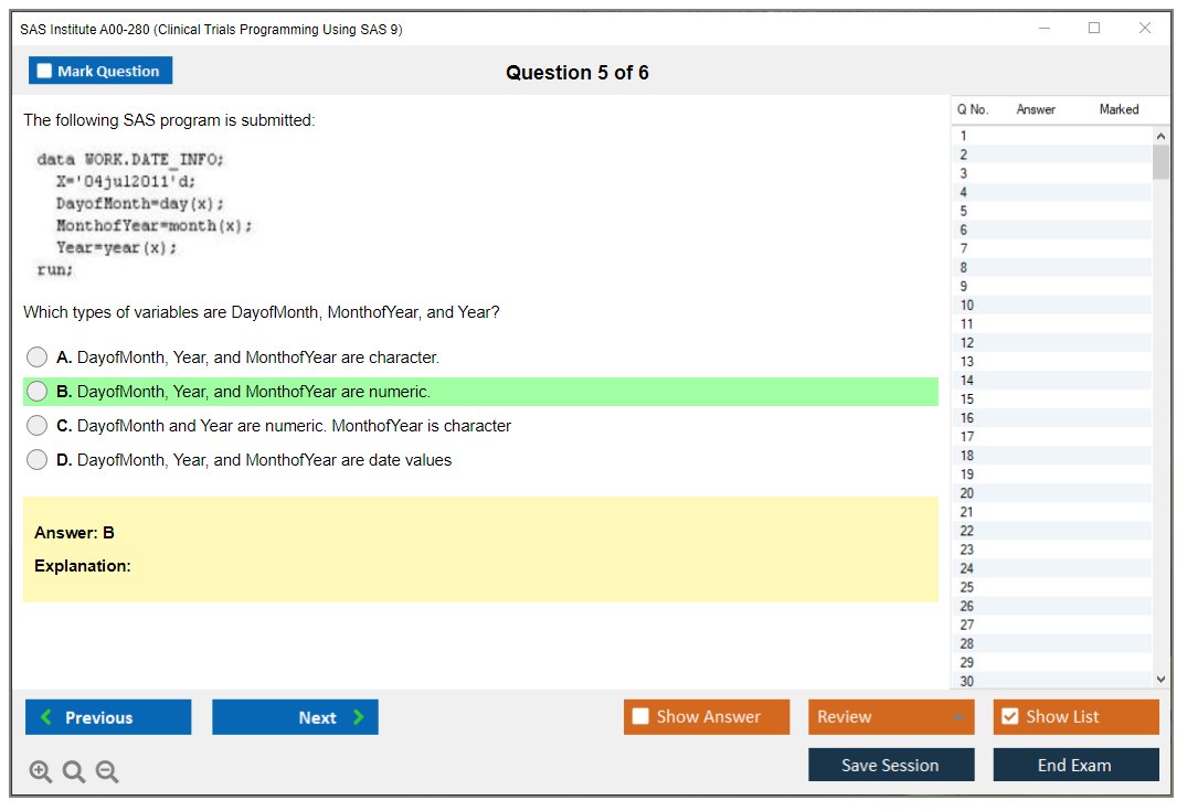 The question format of the SAS Institute A00-280 exam includes multiple-choice and short-answer questions.