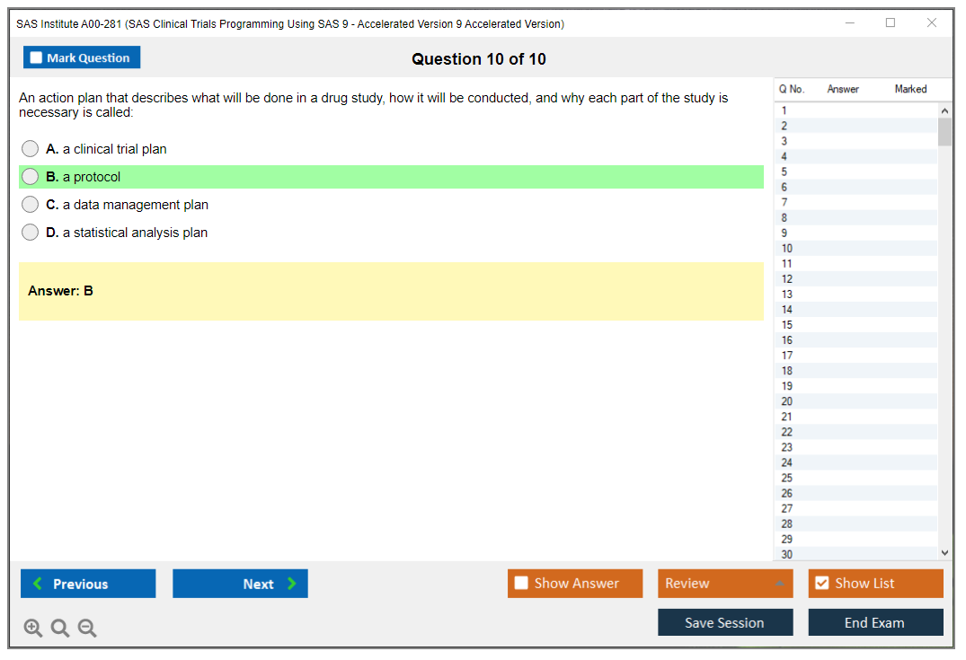The SAS Institute A00-281 (SAS Clinical Trials Programming Using SAS 9 - Accelerated Version 9 Accelerated Version) Exam is designed to validate the skills and knowledge required to manage and analyze clinical trial data using SAS software. It focuses on the use of SAS programming to support clinical trials, including data manipulation, reporting, and statistical analysis.