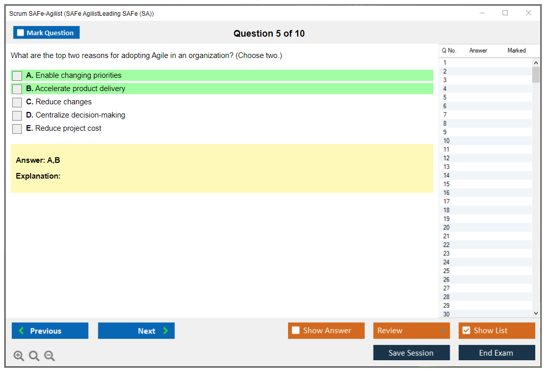 The Scrum SAFe-Agilist (SAFe Agilist - Leading SAFe (SA)(5.1.1)) exam is a certification test designed to validate an individual's understanding of the Scaled Agile Framework (SAFe) and their ability to lead agile transformations within an organization. It covers key concepts such as Lean-Agile principles, SAFe practices, and the implementation of agile methodologies at scale.