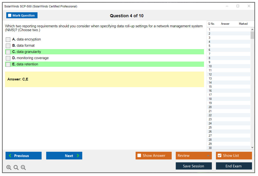 The question format of the SolarWinds SCP-500 Exam includes multiple-choice questions, drag-and-drop questions, and scenario-based questions.