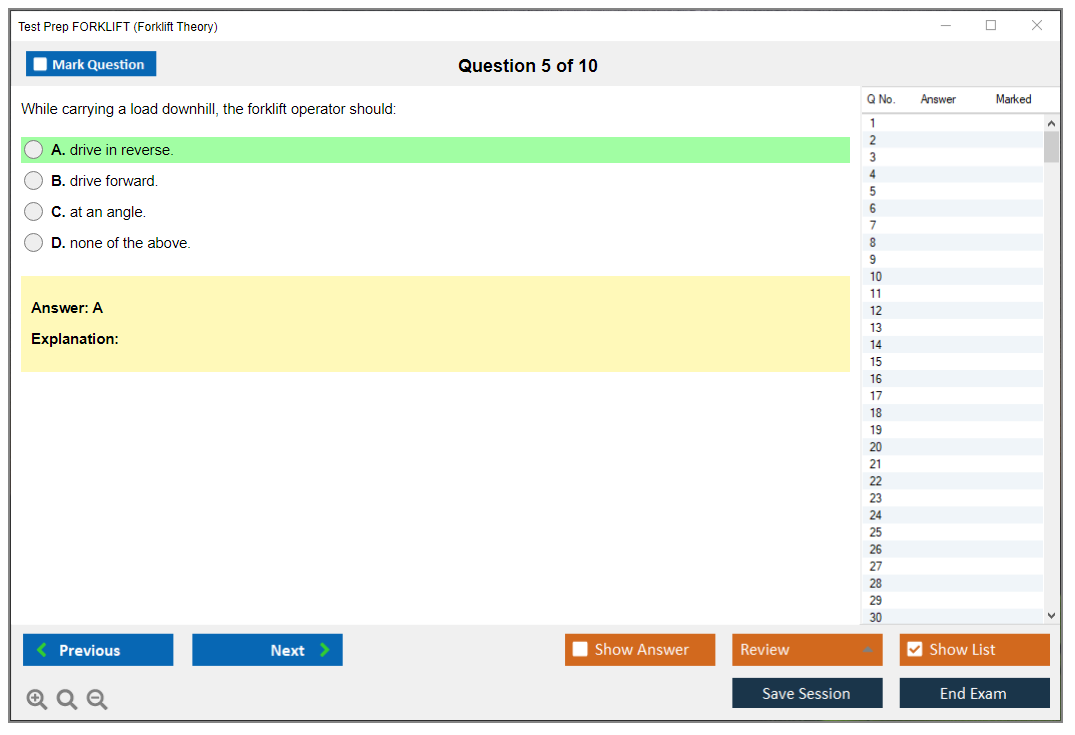 The Test Prep FORKLIFT (Forklift Theory) Exam is designed to assess the knowledge and skills required to safely and effectively operate a forklift. The exam covers various topics related to forklift operation, safety protocols, and regulatory compliance.