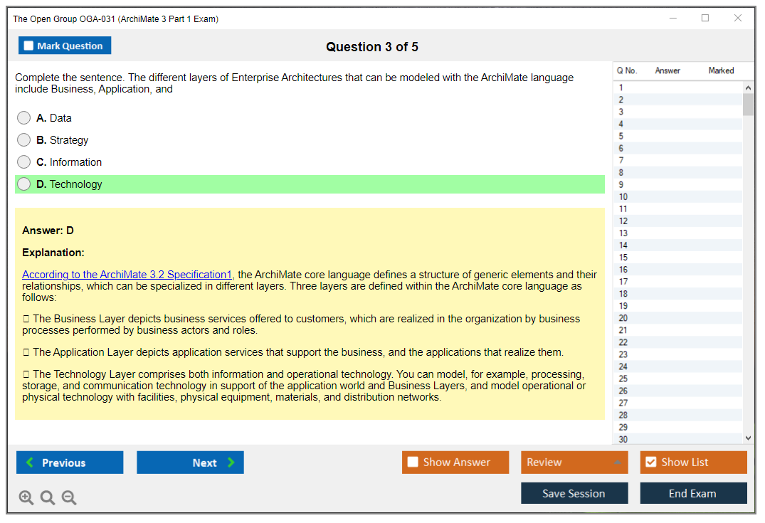 The Open Group OGA-031 (ArchiMate 3 Part 1 Examination) is a certification exam designed to validate the knowledge and understanding of the ArchiMate 3.0 specification, a standard for enterprise architecture modeling.