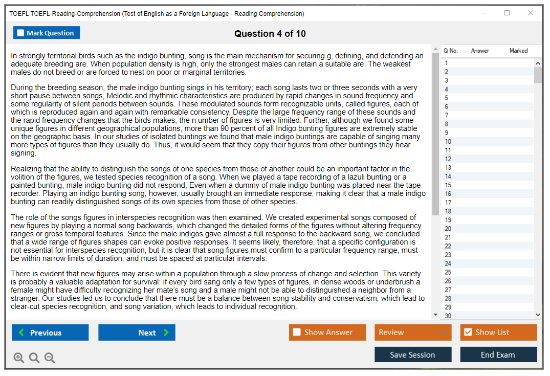 What are the Number of Questions Asked in TOEFL TOEFL-Reading-Comprehension Exam?