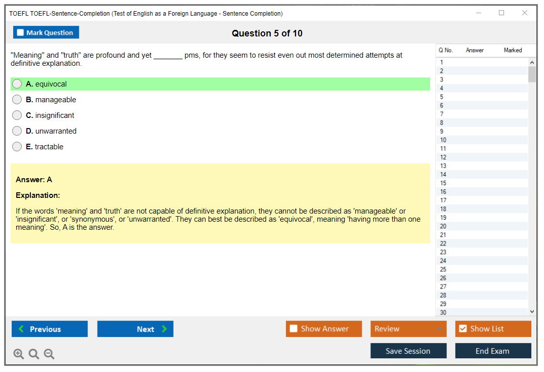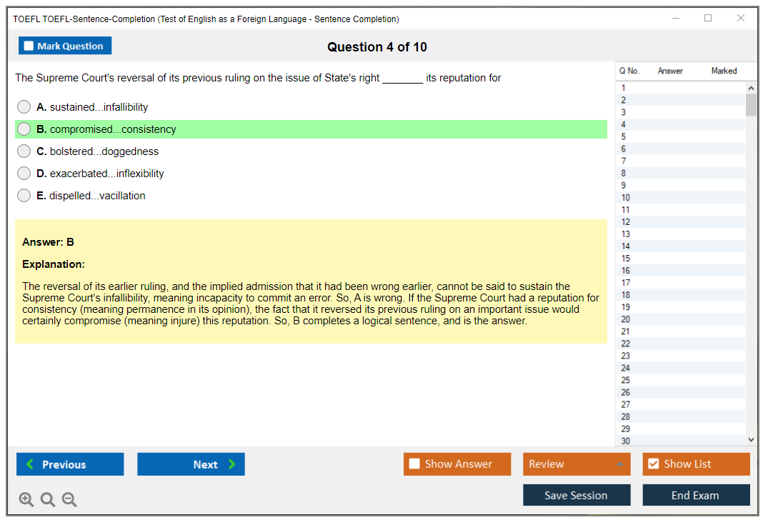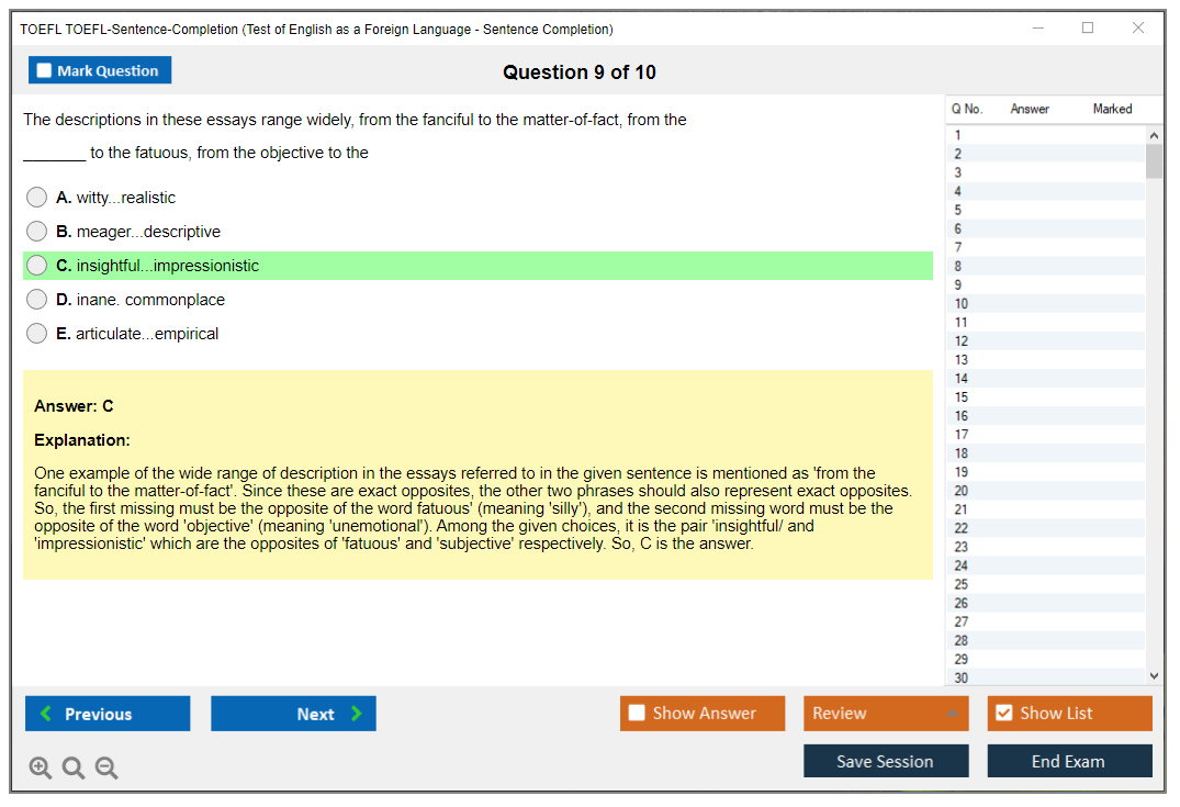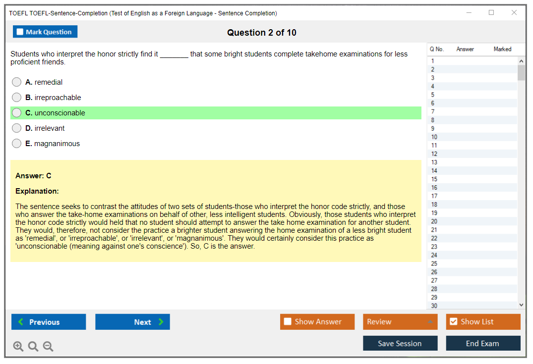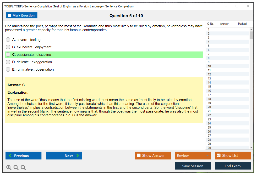 The TOEFL (Test of English as a Foreign Language) Sentence Completion Exam is designed to assess a candidate's proficiency in understanding and completing sentences in English. It is a part of the TOEFL suite of assessments, which are widely used to evaluate the English language skills of non-native speakers.