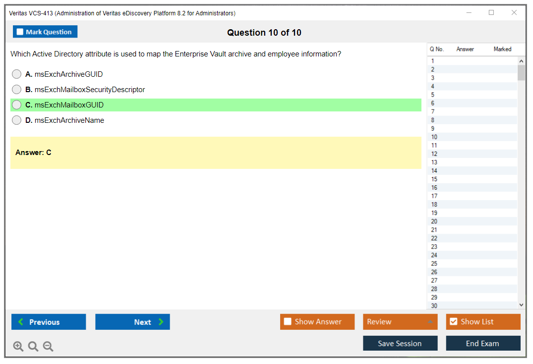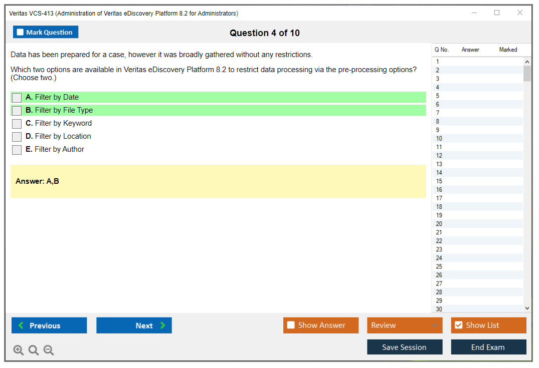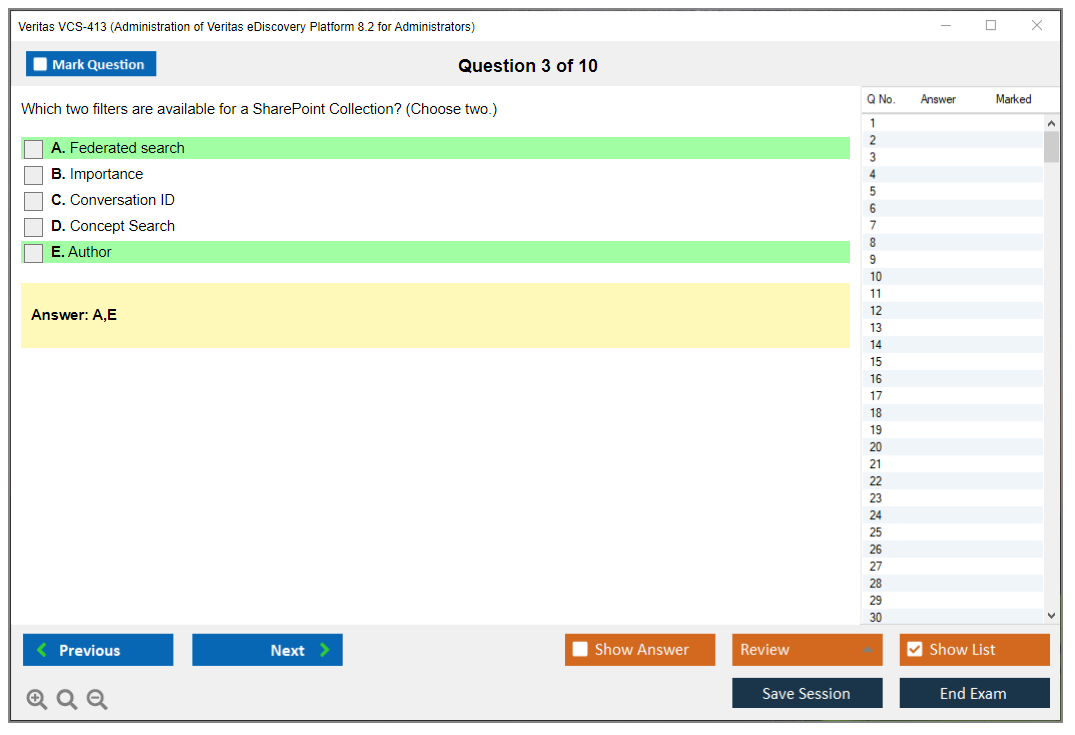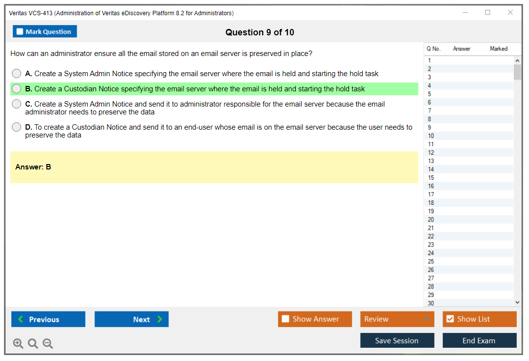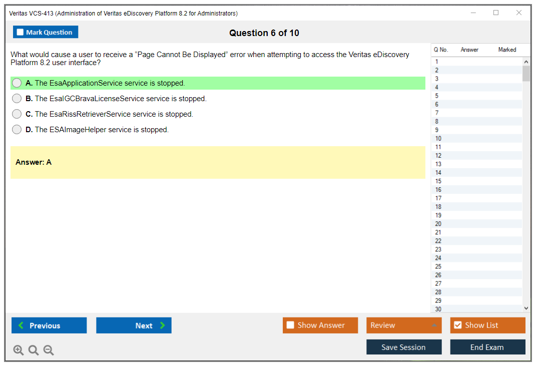 The Veritas VCS-413 (Administration of Veritas eDiscovery Platform 8.2 for Administrators) exam is designed to validate the knowledge and skills required to administer the Veritas eDiscovery Platform 8.2, including tasks such as installation, configuration, maintenance, and troubleshooting.