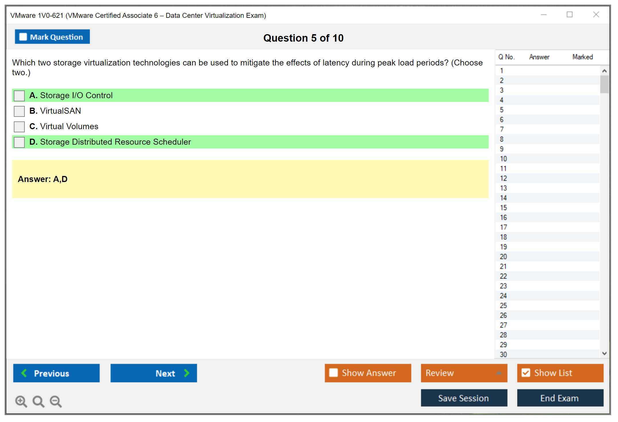 The question format of the VMware 1V0-621 Exam includes multiple-choice, single-choice, and drag-and-drop questions.