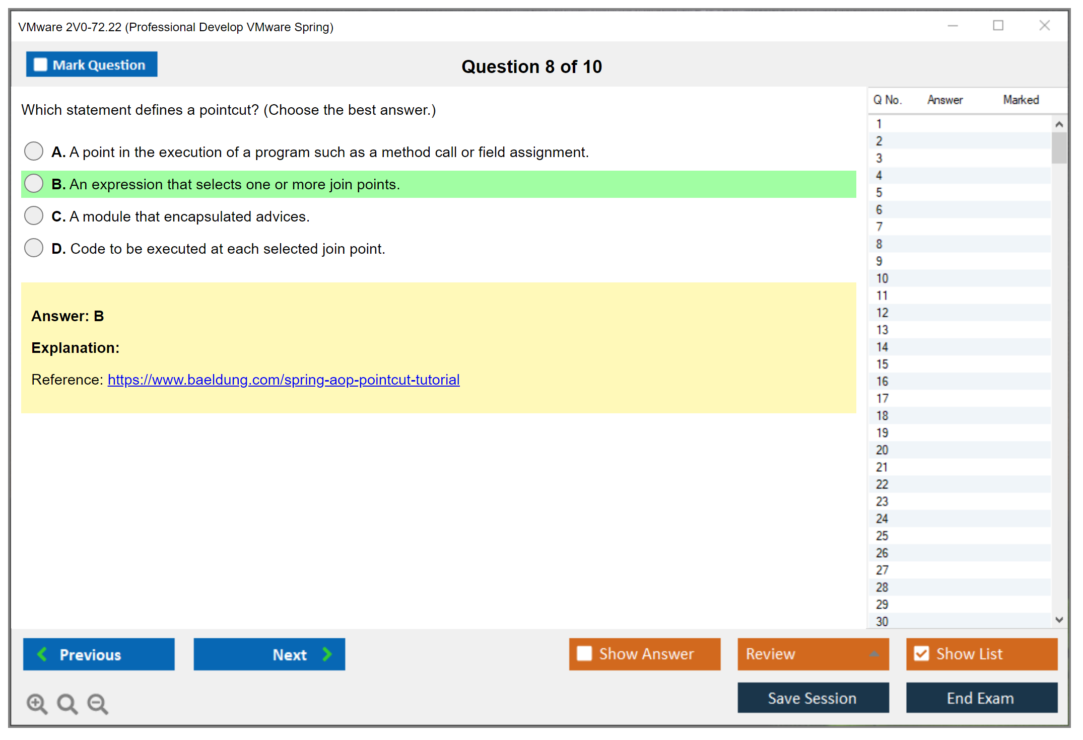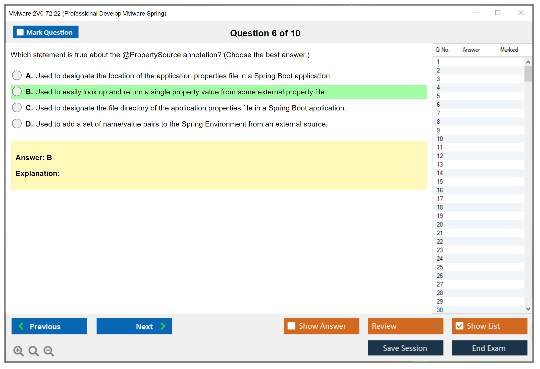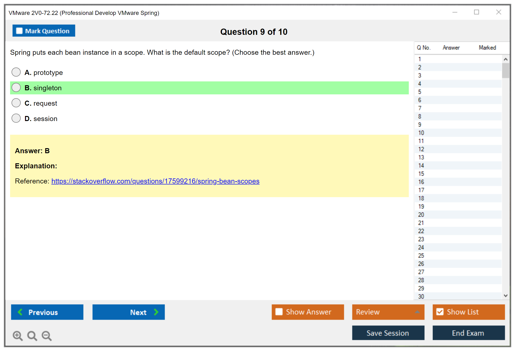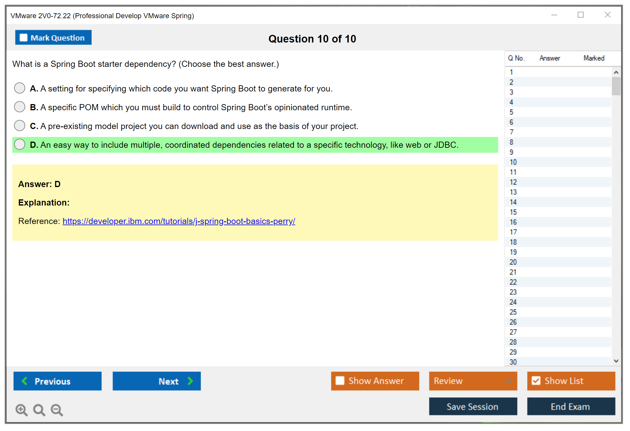 The VMware 2V0-72.22 (Professional Develop VMware Spring) exam validates a candidate's knowledge and skills in using the Spring framework to develop Java applications. It is designed for professionals who work with Spring and want to demonstrate their expertise.